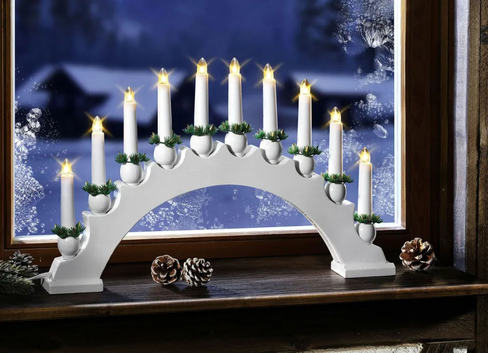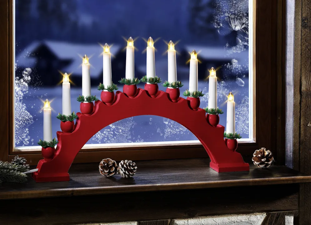 Dieser klassische, 10-flammige Leuchter aus Holz zaubert echte Weihnachtsstimmung in Ihr Zuhause! Detailreich gearbeitet und mit kleinen Tannenzweigen dekoriert erstrahlt dieses Schmuckstück in klarem Licht. 240 Volt, 3 Watt, Fassung C6. Maße: L47xB5xH31 cm.