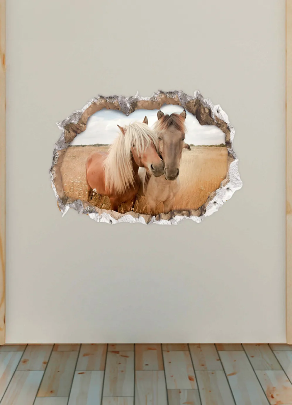 Holen Sie sich Ihren Lieblingsort doch einfach in Ihr Zuhause! Mit diesem tollen 3D-Wand-Tattoo Pferde sieht es so aus, als würde hinter dem gezeigten Durchbruch eine andere Welt auftauchen. Ganz einfach an die Wand oder Tür zu kleben. Aus 50% PVC, 40% Papier und 10% Klebstoff. Maße: B100xH70 cm