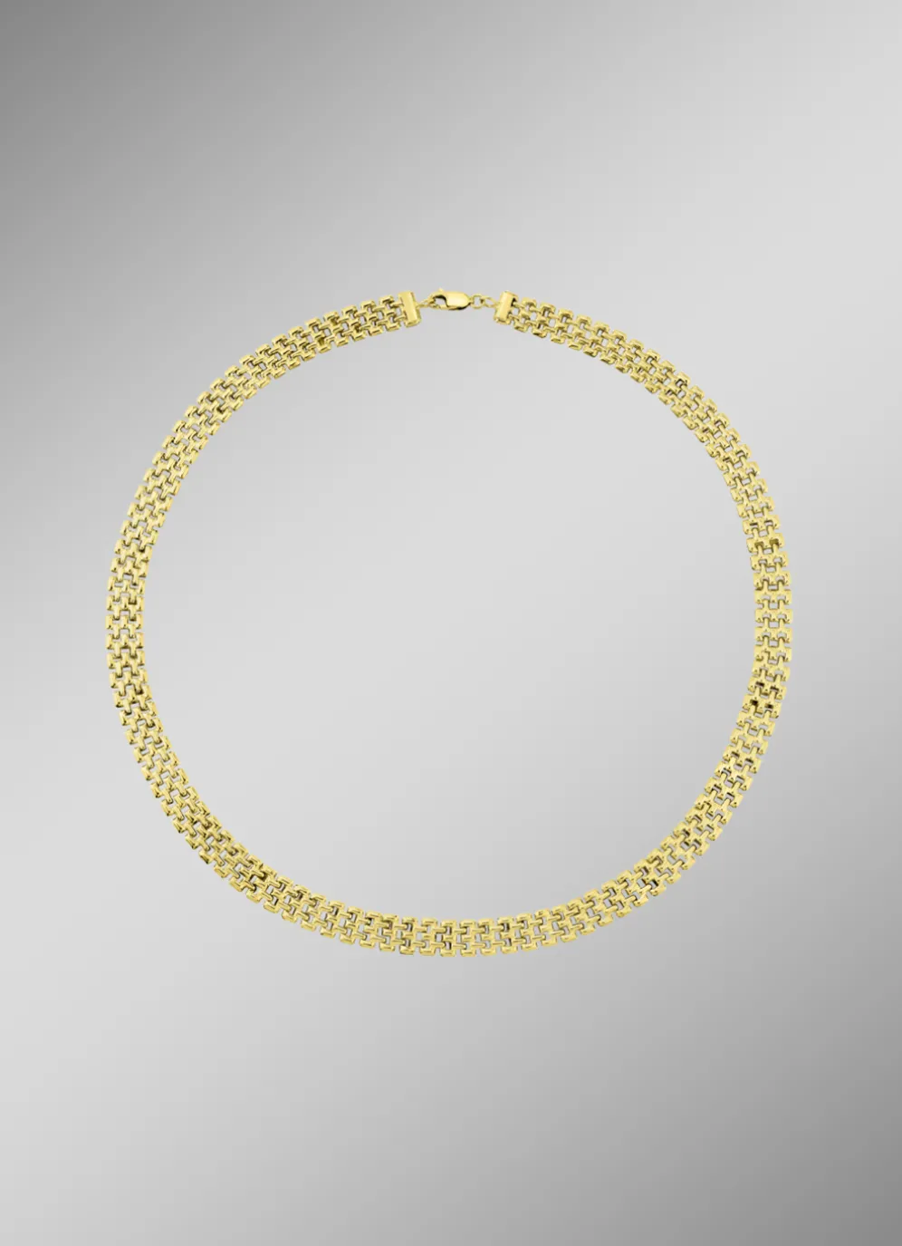 Elegant und attraktiv sind diese Halskette oder dieses Armband in 5-reihigem Backstein-Design, die Sie wahlweise in Gold 585/- fein oder Gold 333/- fein erhalten. Bei besonderen Anlässen lassen Sie diese Schmuckstücke in schwerer, hochwertiger Ausführung in umwerfendem Glanz erstrahlen. Die Breite beträgt 8 mm. Als Verschluss dient ein Karabiner mit Anstössen. Dieser Schmuck wird Sie auf Anhieb begeistern!