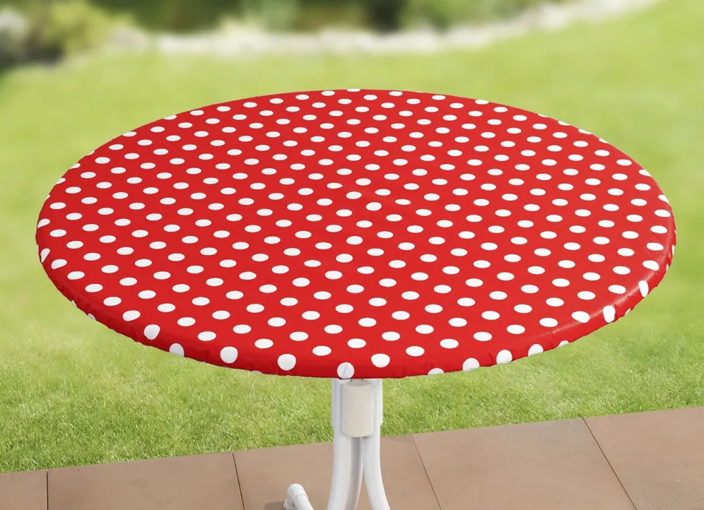 Die Spann-Tischdecke mit Punkte-Dessin passt sich perfekt dem Tisch an und schützt ihn vor Schmutz und Flecken. Einfach über den Tischrand ziehen. Dank integriertem Gummiband bleibt die Decke immer glatt, ohne zu verrutschen.