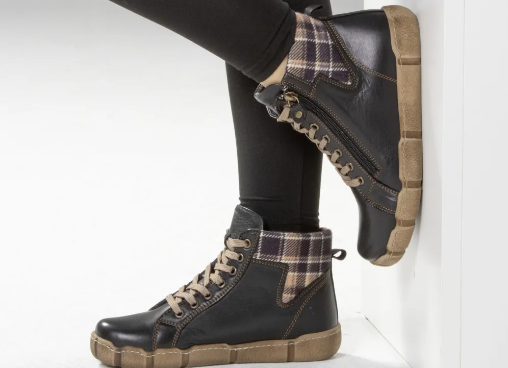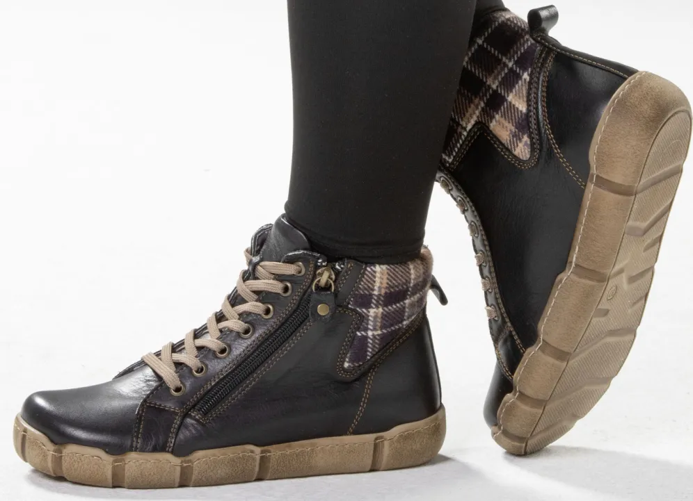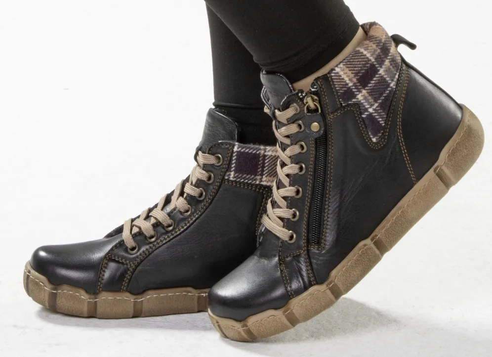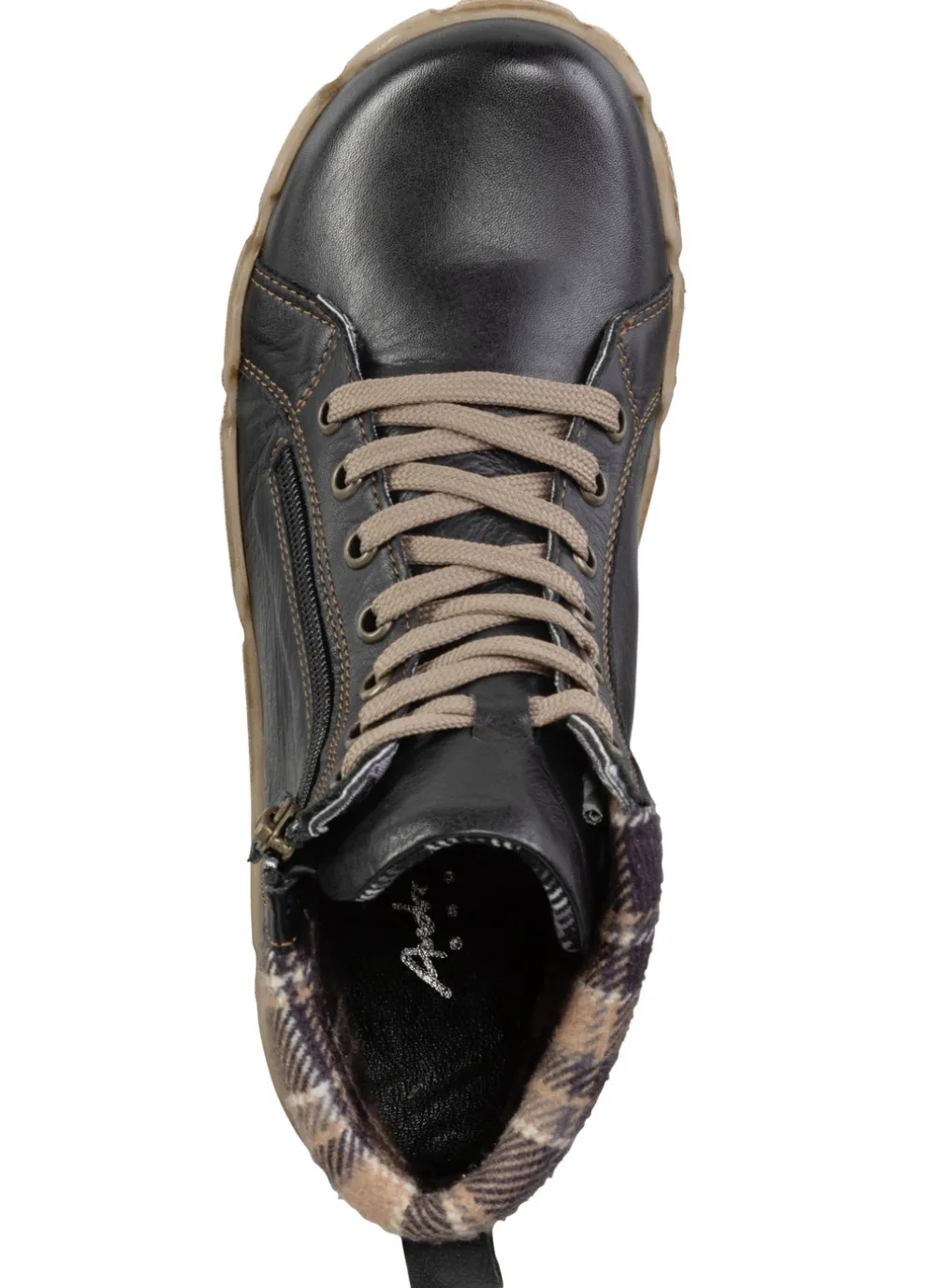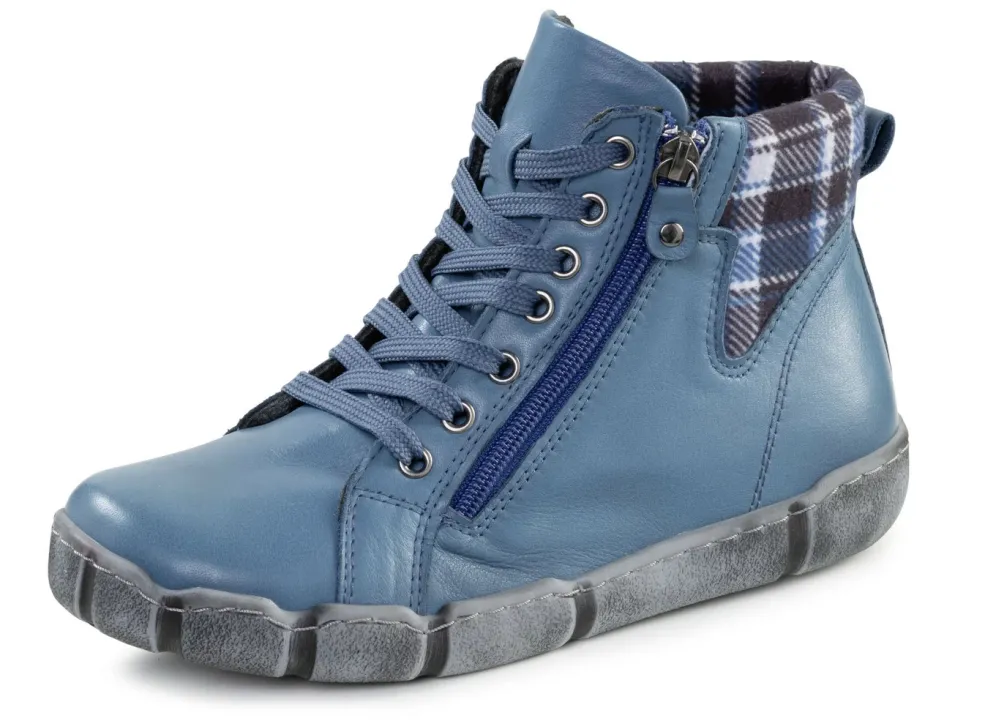 Schnür-Bootie aus weichem Nappaleder, mit gepolstertem Schaftrand aus kariertem Textil: Seitenreißverschluss, Textilfutter, herausnehmbares Lederfußbett, leichte TPR-Riffelsohle sowie 10 mm Keilabsatz. Schafthöhe ca. 11 cm