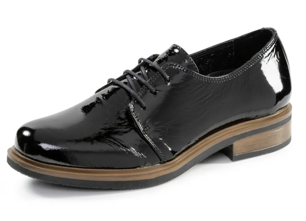 Schwarzer Schnürschuh aus edlem Knautschlackleder: Lederfutter, herausnehmbares Lederfußbett, leichte TR-Laufsohle mit markanter Rahmen-Verarbeitung sowie 20 mm Absatz
