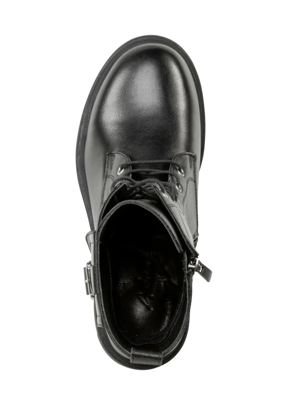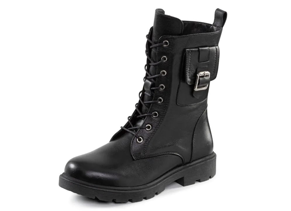 Schnür-Stiefelette aus Nappaleder, mit aufgesetztem Täschchen: Innenreißverschluss, Textilfutter, herausnehmbares Lederfußbett, leichte TR-Profilsohle, 20 mm Absatz. Schafthöhe ca. 19 cm