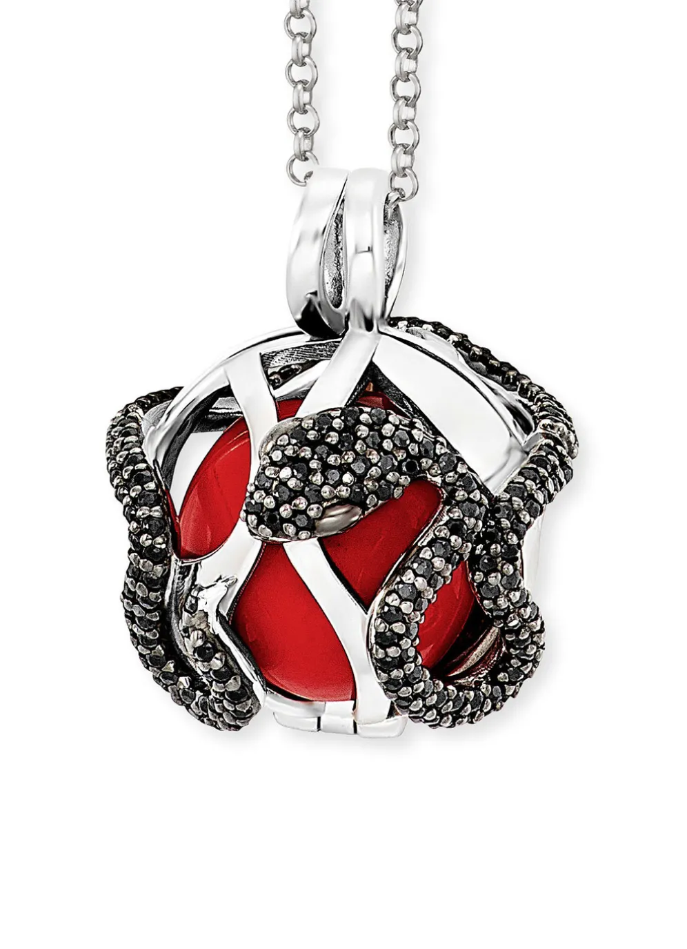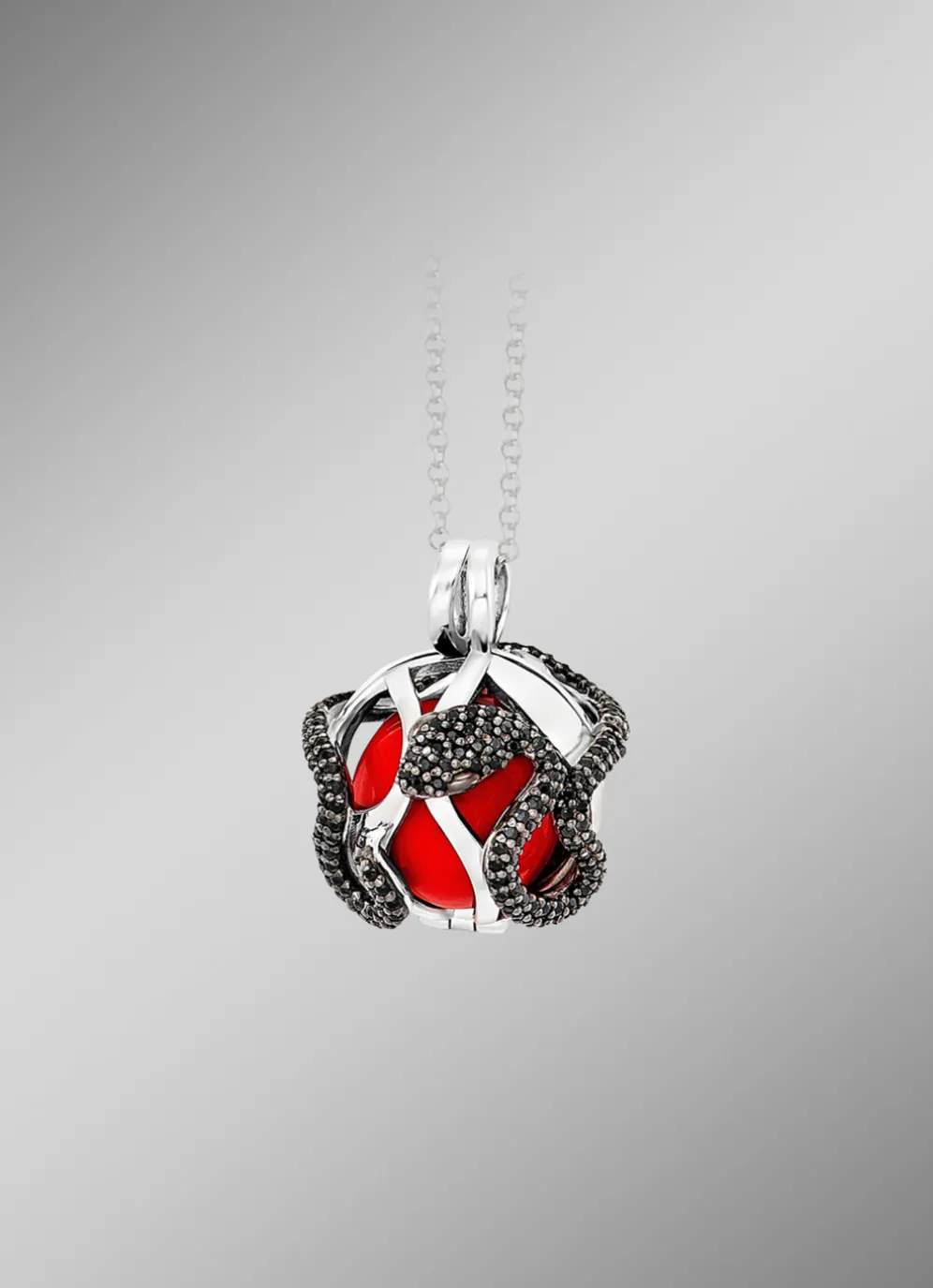 Die Schlange und der rote Apfel vereinen sich und wecken Erinnerungen an den Garten Eden. Dabei umgibt die edle Schlange das Schmuckstück wachsam und schützend. Die rote Klangkugel im Inneren transportiert Wärme, Liebe und Leidenschaft.