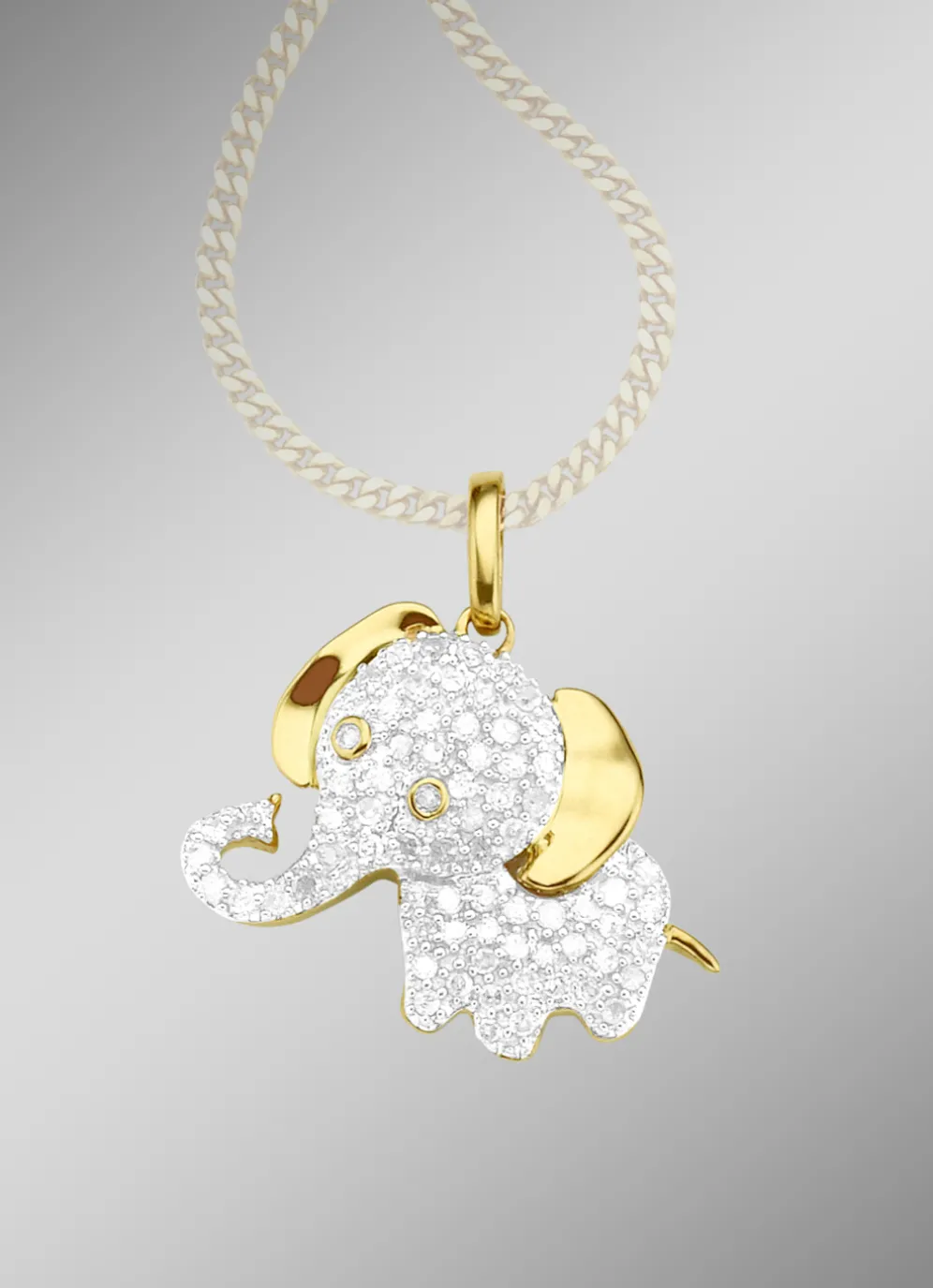 Der Anblick dieses süßen Elefanten-Anhängers wird Sie immer zum Lächeln bringen! Der Halsschmuck, mit 71 Diamanten, Weiß, zusammen ca. 0,20 ct, Piqué 2, gefasst in Gold 585/- fein ist ein richtiger Hingucker.