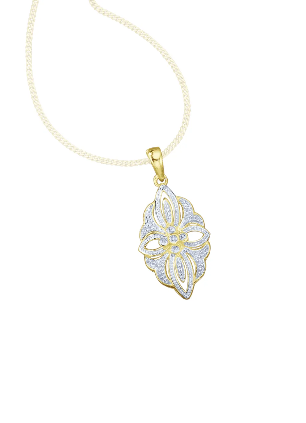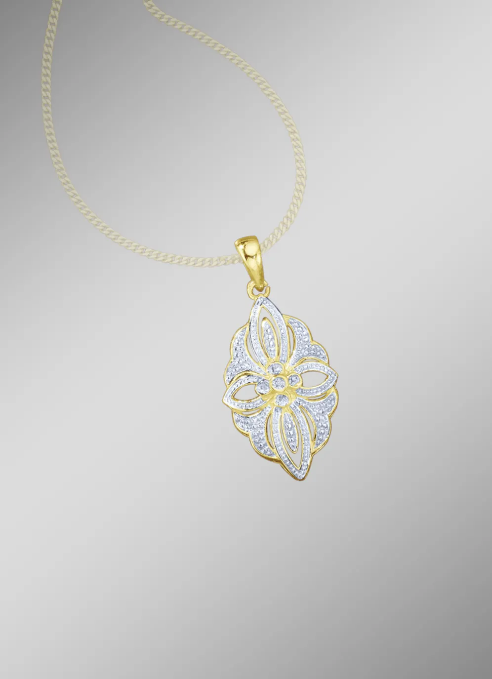Schicker Anhänger in Bicolor aus Silber 925/- fein verziert mit 4 Diamanten, Weiß, Piqué 2. Dieses besondere, vergoldete Schmuckstück im Blumendesign, fällt vor allem aufgrund seines Designs ins Auge und ist 27 mm lang.