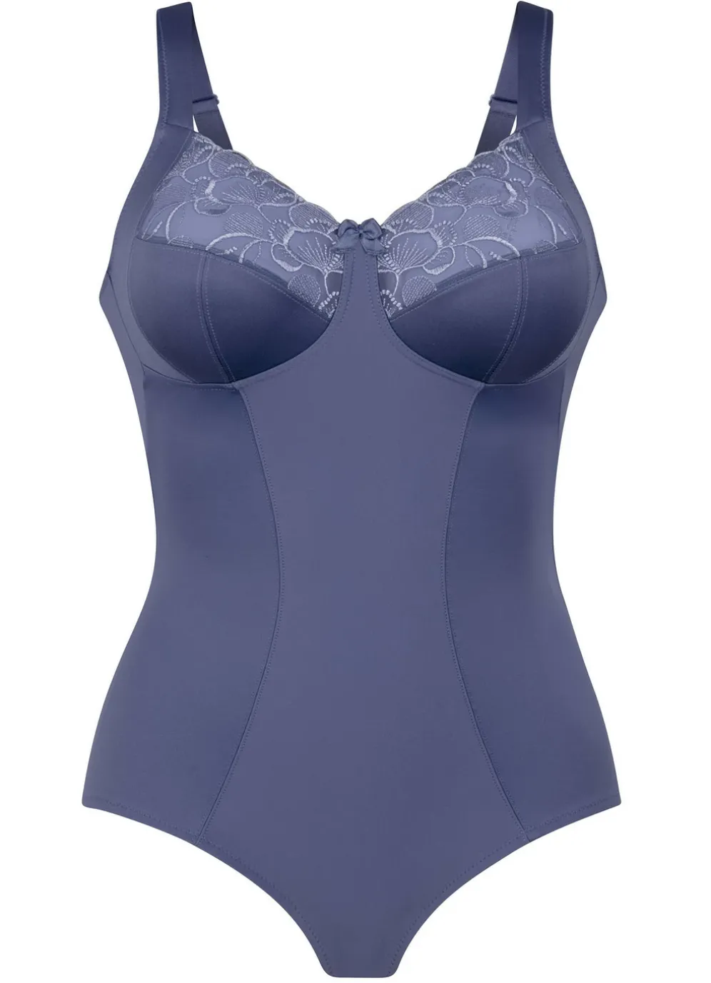 „Anita“-Hosenkorselett: elastische Tüllstickereispitze am Dekolleté, Verstärkung im Vorderteil, weich gepolsterte, verstellbare Stretchträger, Hakenverschluss und Baumwolleinlage im Schritt.