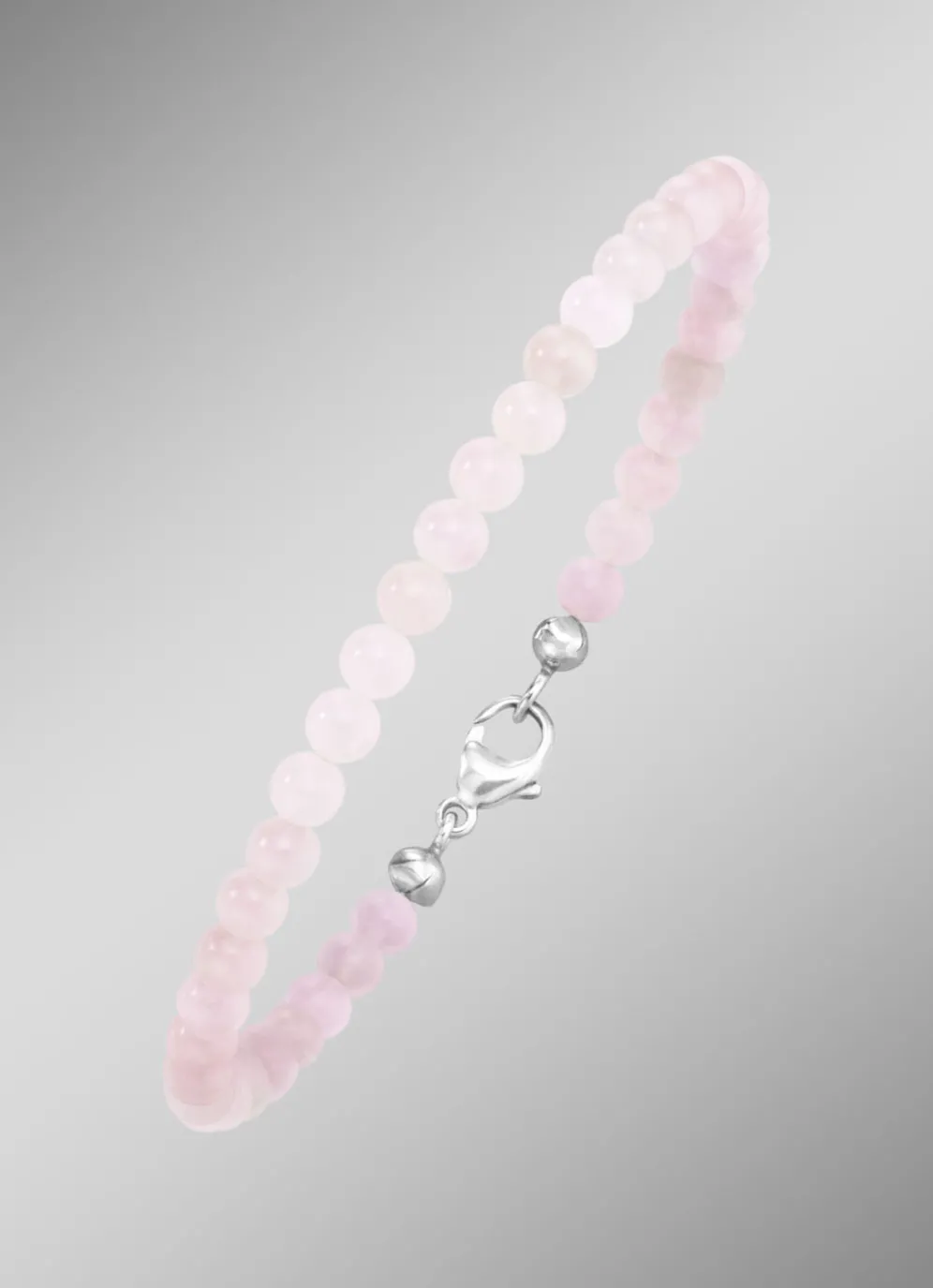 Dieses charmante Armband aus feinstem 925er Silber vereint stilvolle Schlichtheit und natürliche Schönheit. Mit den 4,5 mm großen Kugeln aus echtem Rosenquarz, die ein Gewicht von ca. 22,00 ct aufweisen, strahlt es eine feminine, beruhigende Ausstrahlung aus. Der praktische Karabinerverschluss und die Länge von 20 cm garantieren eine angenehme Passform und hohen Tragekomfort.