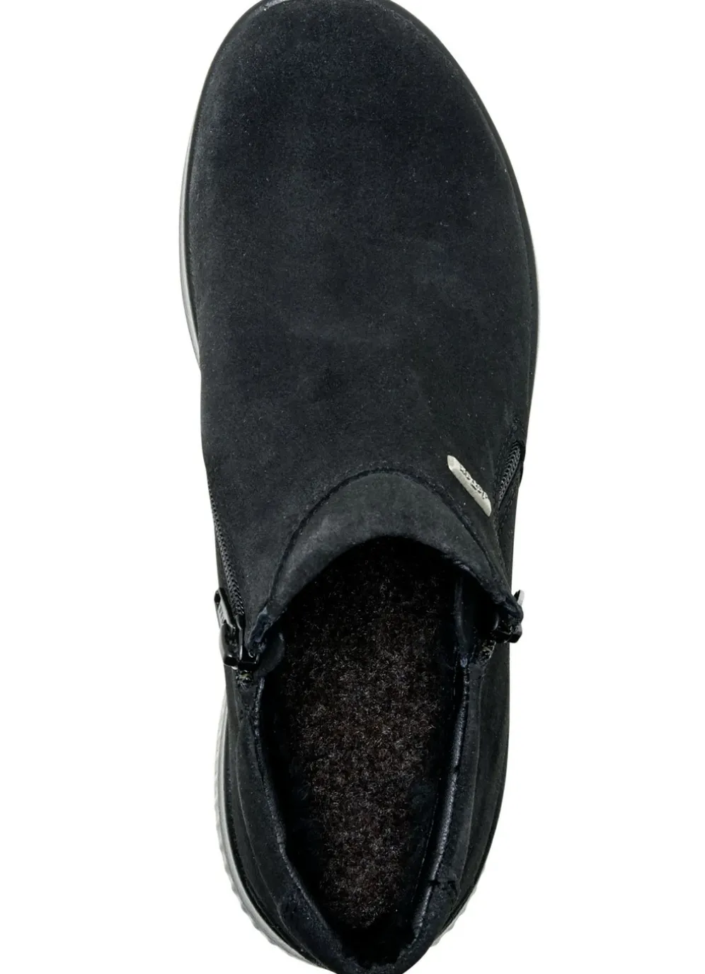 Schwarze Boots aus Rind-Veloursleder, mit zwei Seitenreißverschlüssen: Weite K, mit Klimamembrane ausgestattet, Warmfutter aus 100% Polyester, herausnehmbare Decksohle, leichte PUR-Luftpolster-Profilsohle, 25 mm Keilabsatz. Schafthöhe ca. 7 cm