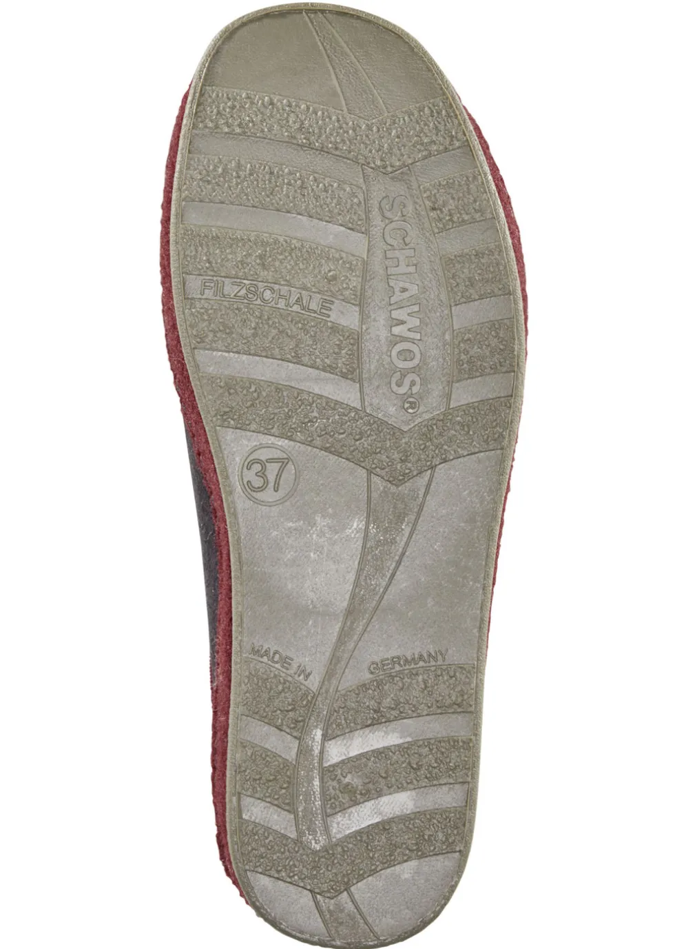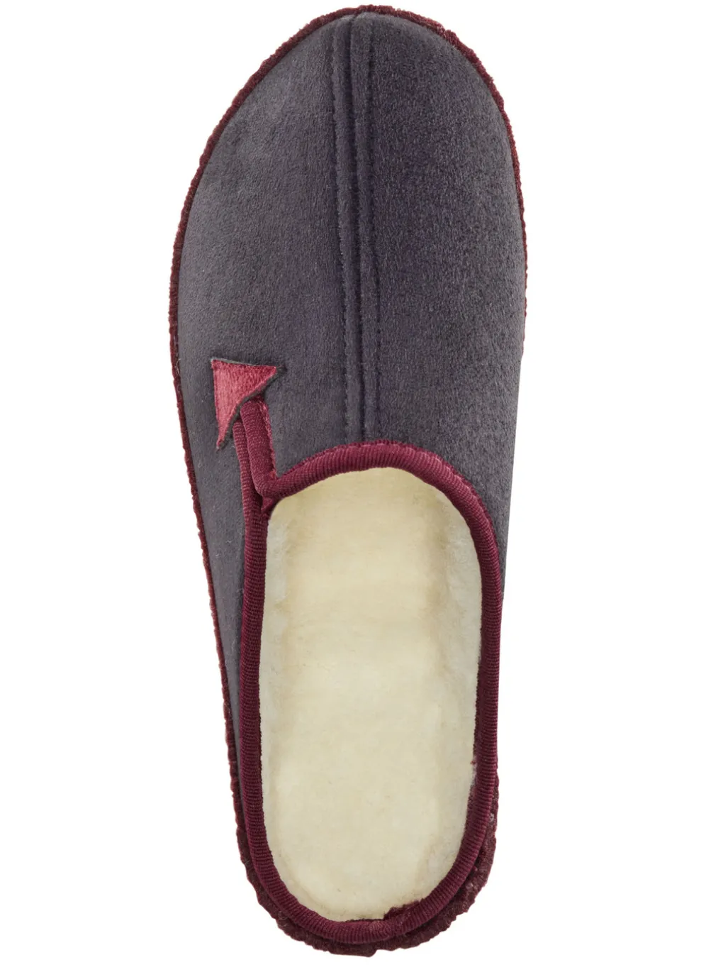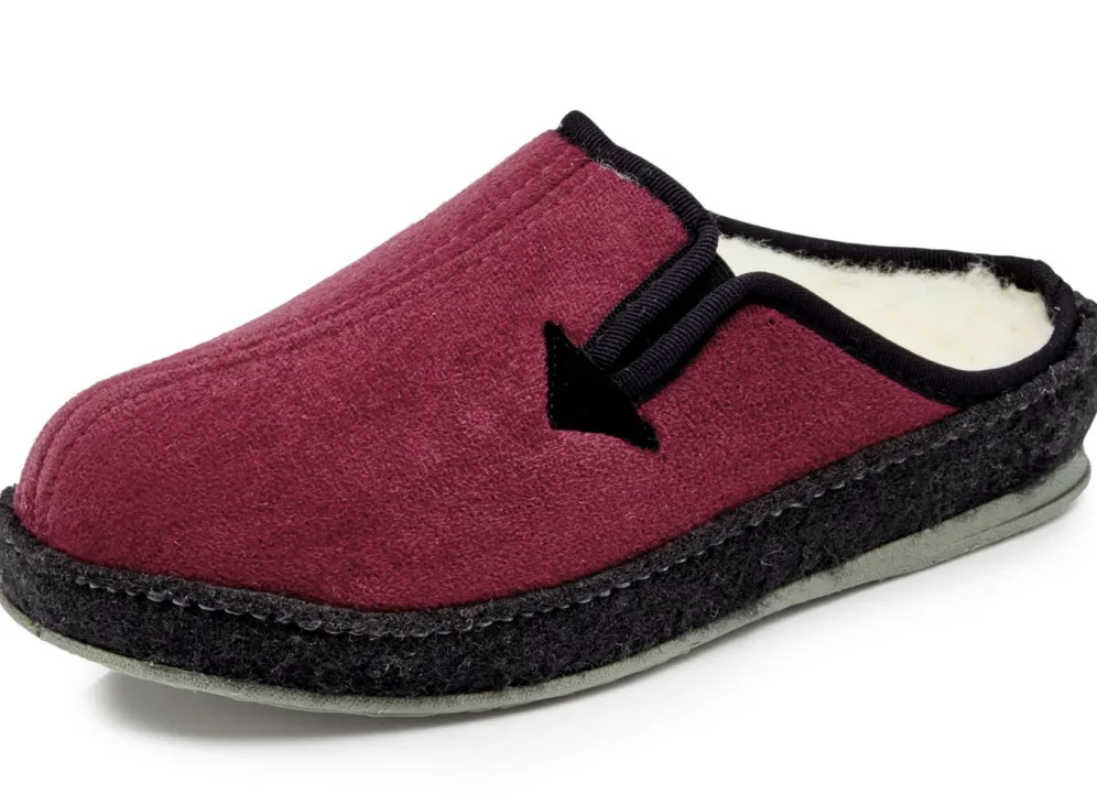 Atmungsaktive Hausschuhe aus Veloursmaterial: seitlicher Gummizug, Warmfutter und Fußbettbezug aus 100% Schurwolle, Fersenluftpolster, Filzschalensohle, TR-Laufsohle und 25 mm Keilabsatz