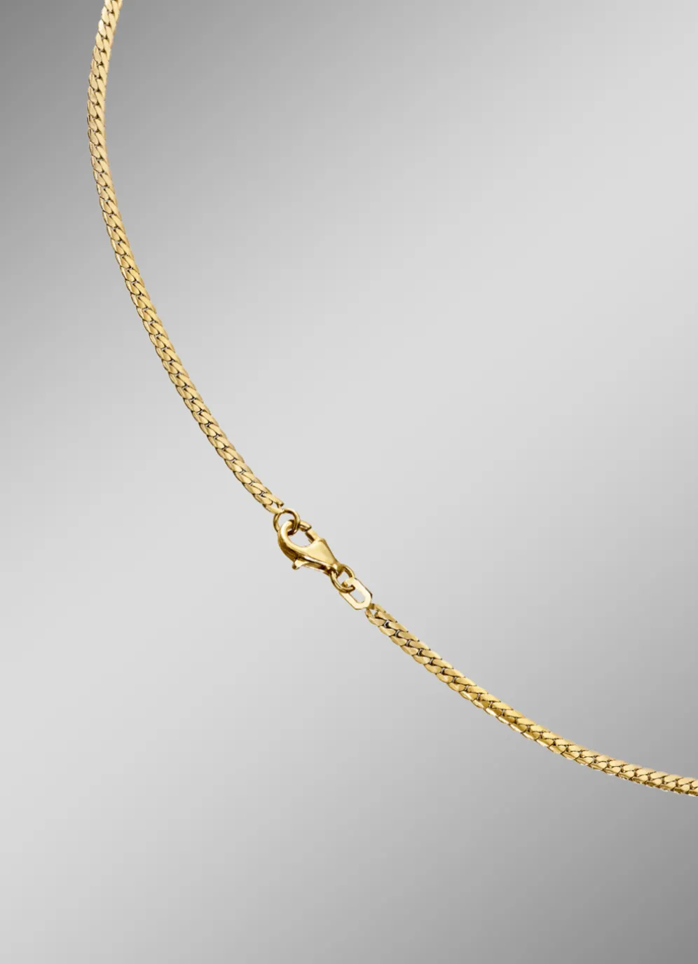 Mit femininer Leichtigkeit präsentiert sich diese Panzerkette. Sie hat eine Breite von 2 mm und ist in verschiedenen Längen erhältlich. Als Verschluss ist ein Karabiner angebracht.