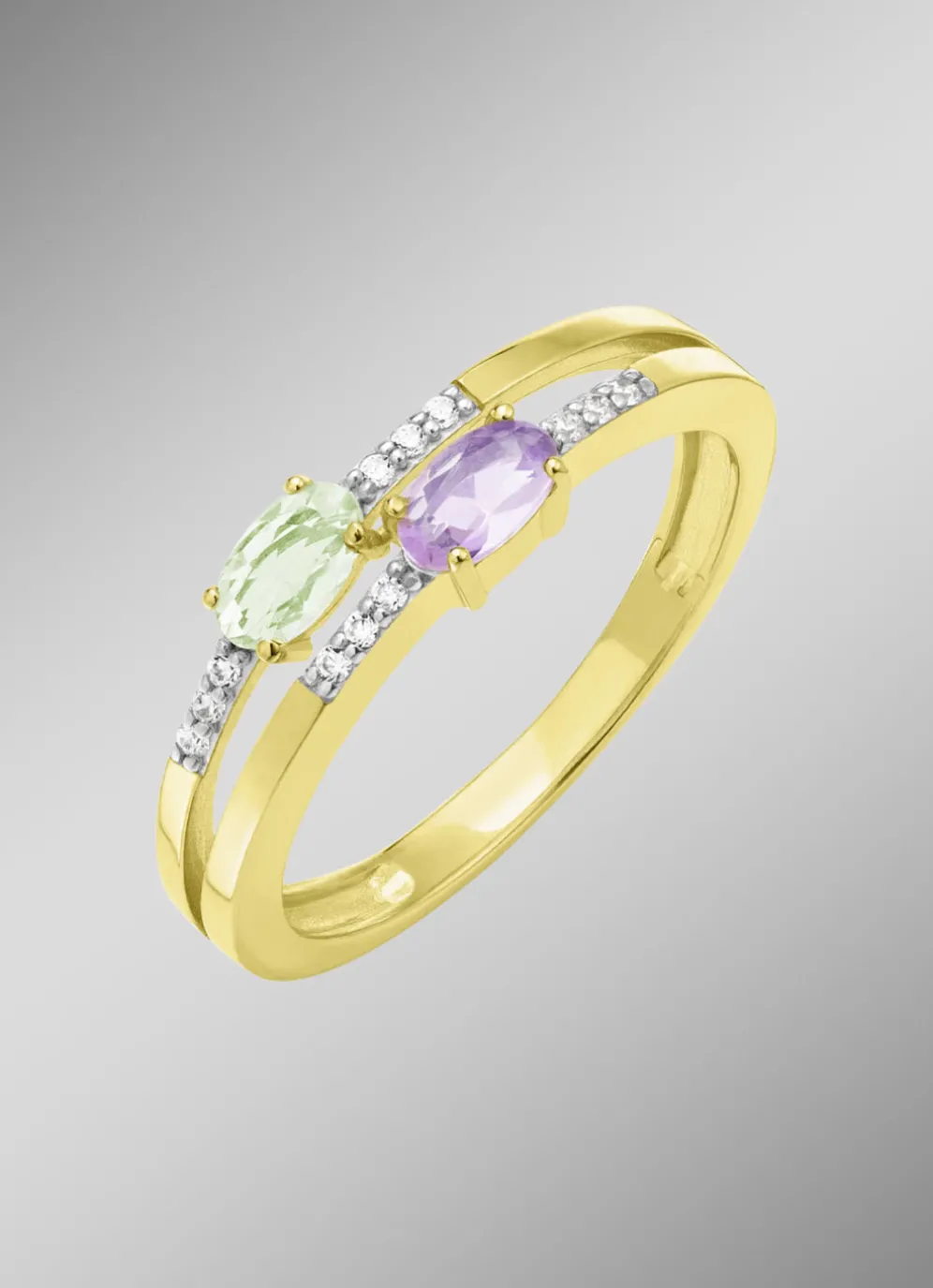 Lassen Sie sich verzaubern von der zarten Eleganz dieses Damenrings aus vergoldetem Silber 925/- fein. Mit seinem edlen Design und den kunstvoll eingefassten Glassteinen in Mint und Lavendel strahlt er eine unvergleichliche Leichtigkeit und Frische aus.