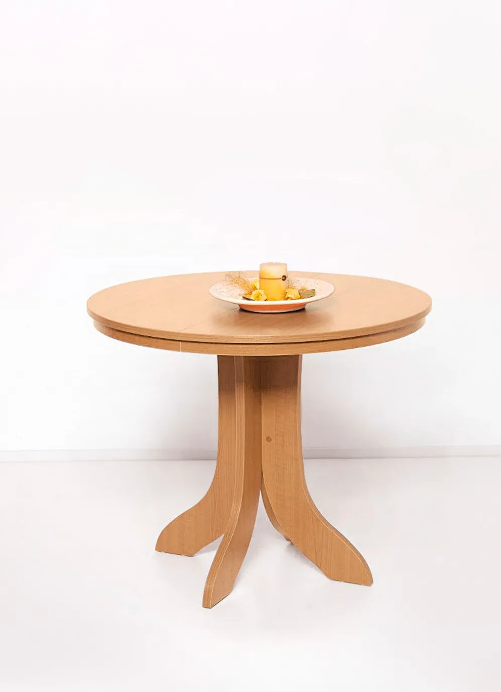 Ausziehbarer Esstisch in der Ausführung Runder Tisch und in Buche.