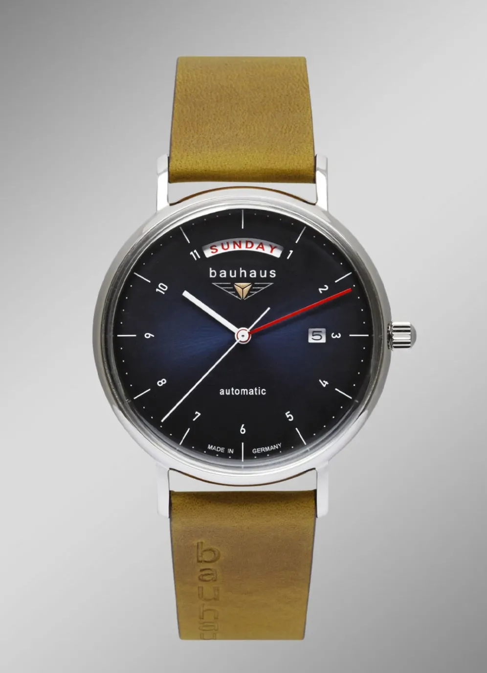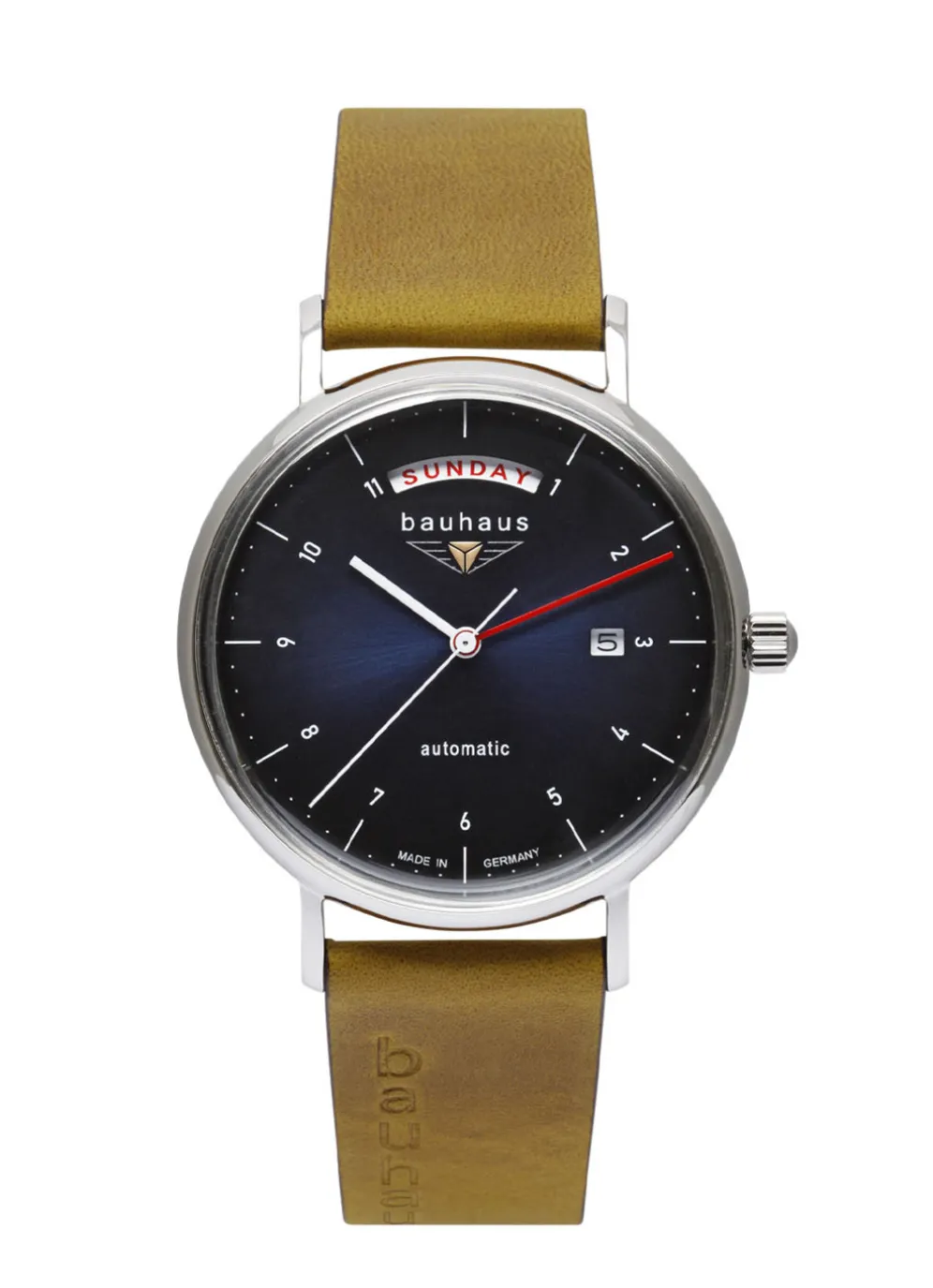 verfügt über die Groß-Tag-Anzeige bei 12 Uhr, die sich hervorragend in das minimalistische Design der Serie einfügt. Das blaue Sonnenschliff-Zifferblatt, die zweifarbig ausgeführten Zeiger, das abgerundete Gehäuse und Glas verleihen dieser Uhr eine Anmutung von Qualität und Eleganz und machen Sie so zum i-Tüpfelchen für jeden Look. Poliertes Edelstahl, extra kratzfestes K1-Sicherheitsglas und ein Uhrwerk des japanischen Traditionsherstellers Citizen/MIYOTA, das man durch den Glasboden betrachten kann, lösen das Versprechen höchster Qualität ein. Bei dem Armband der Uhr handelt es sich um ein kunstvoll handgearbeitetes italienisches Lederband in Mais-Farbe, mit „Bauhaus“-Prägung und einer Länge von 20 cm.