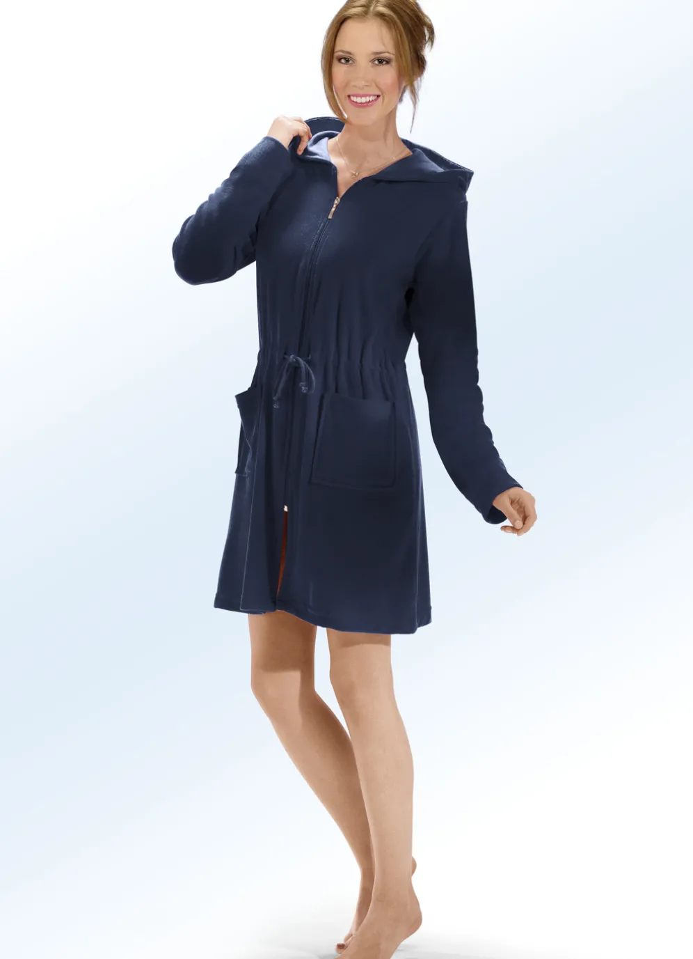 Pfiffiger Bademantel in kurzer Form, mit Kapuze, durchgehendem Reißverschluss, zwei aufgesetzten Taschen sowie aktuellem Tunnelzugband in Hüfthöhe zum lockeren Binden.