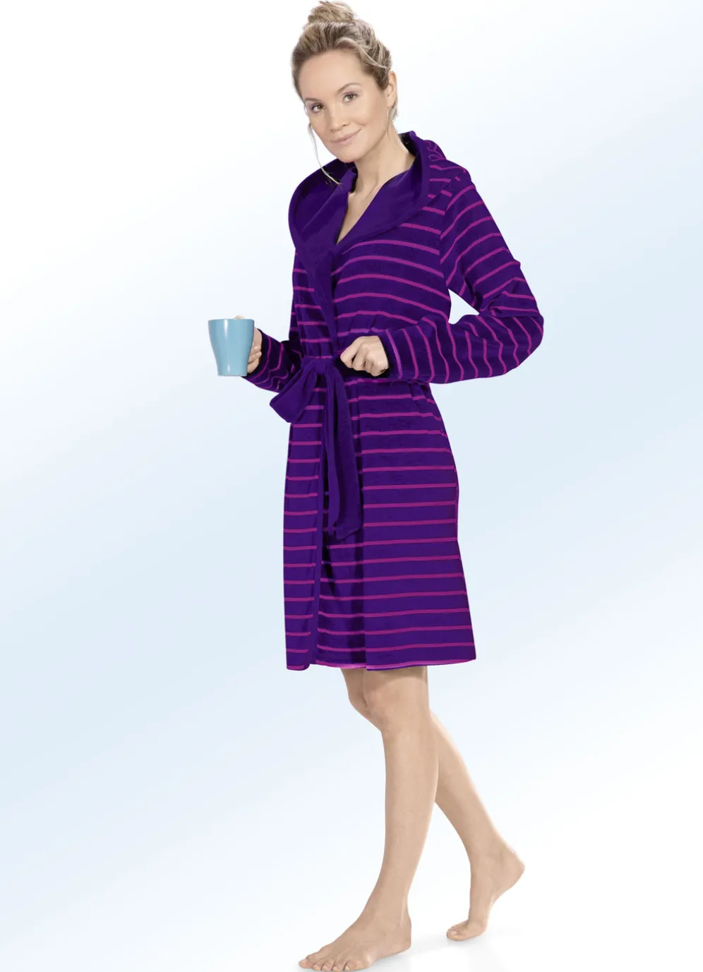 Kuschelweicher Laurina-Bademantel in kurzer Form, mit angesagtem Streifen-Dessin allover, Kapuze, zwei Seitennahttaschen, langen Ärmeln, Gürtelschlaufen und Bindegürtel.