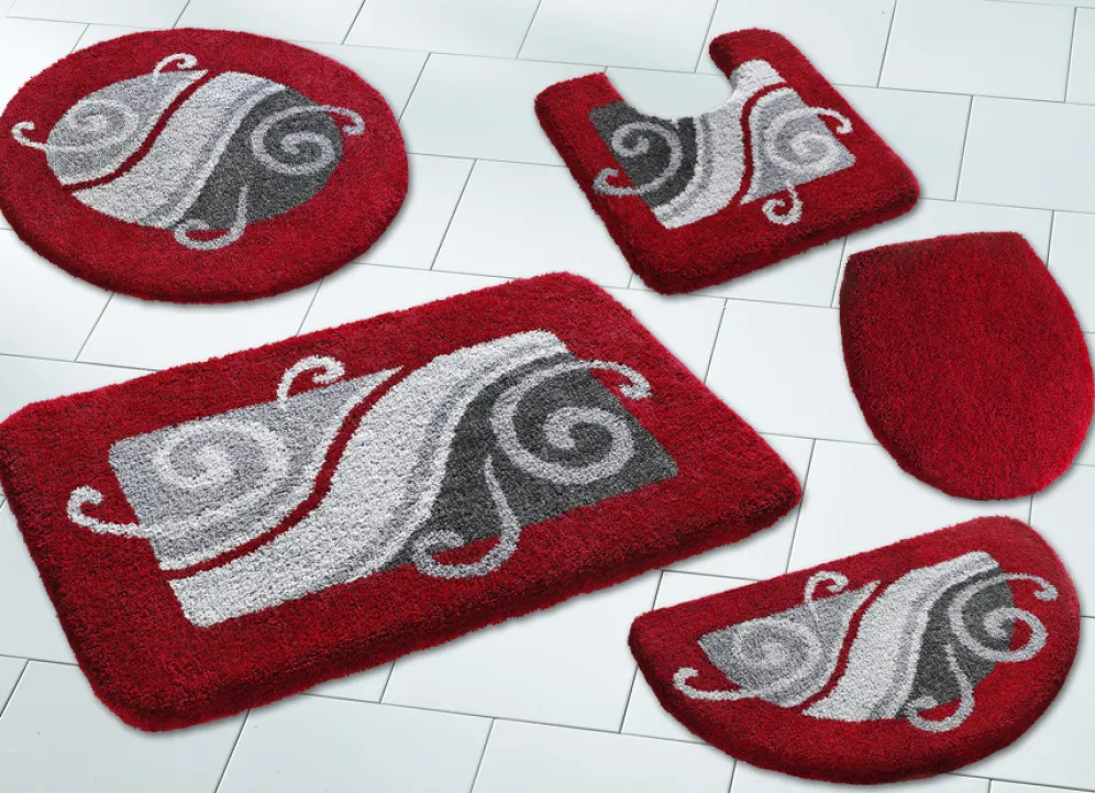 Badgarnitur mit 20 mm Florhöhe von Grund in Größe 109 (Hänge-WC-Vorleger, 50/ 50 cm) und in Rot-Grau.