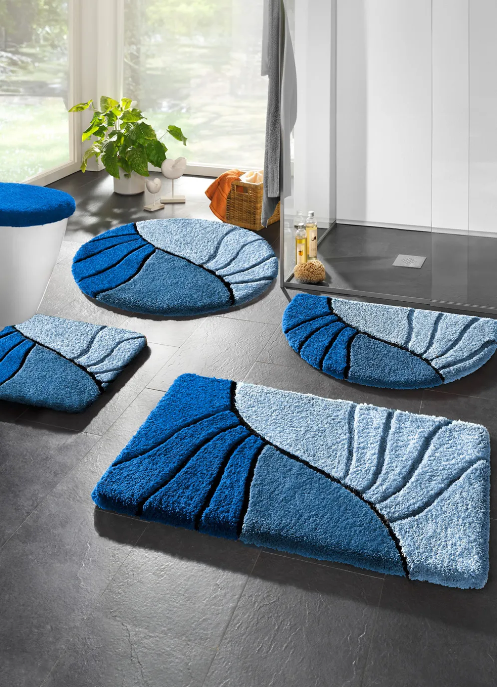 Badgarnitur mit rutschhemmender Rückseite in Größe 112 (WC-Deckelbezug, 47/ 50 cm) und in Blau.