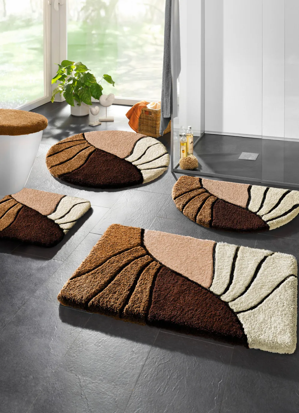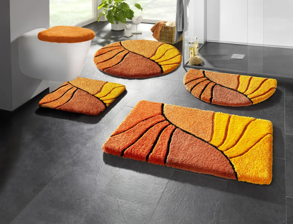 Individuelle Badgarnitur mit rutschhemmender Rückseite. Florhöhe: 20 mm. Qualität: Table Tuft aus 100% Polyacryl. Waschbar bis 30 °C. Für Fußbodenheizung und Trockner geeignet.