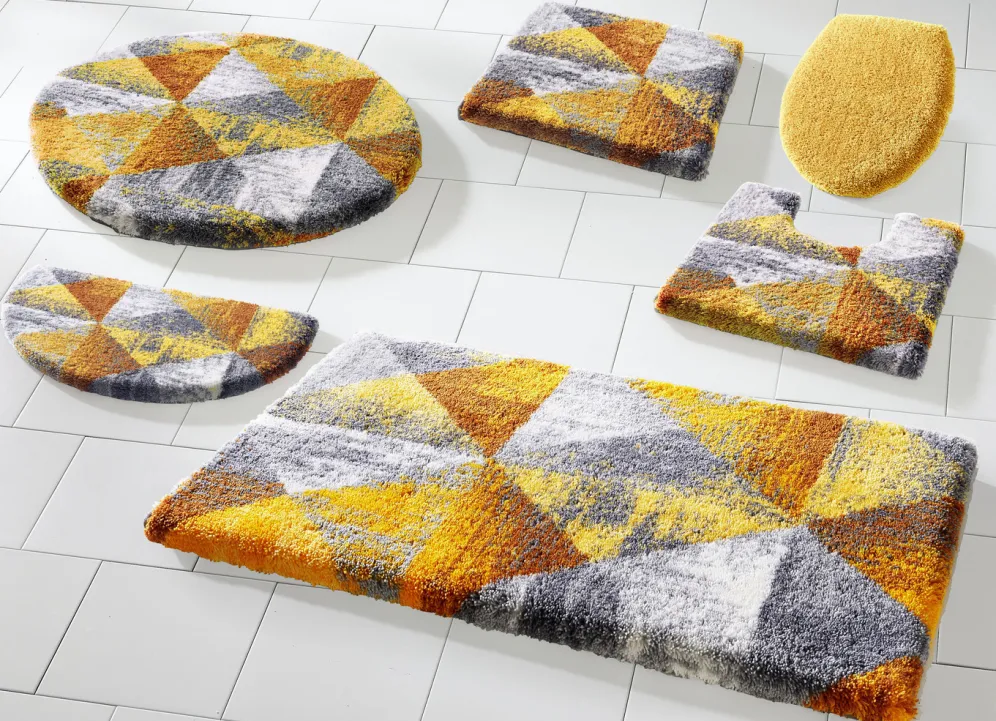Ein modernes Wohlfühl-Ambiente kreieren Sie mit dieser bildschönen Badgarnitur von „Grund“, die mit geometrischem Dessin überzeugt. Höhe 20 mm. Mit latexbeschichteter, rutschhemmender Rückseite.