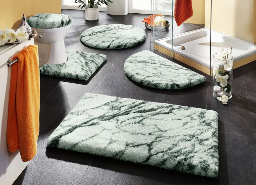 Mit Eleganz und Klasse zieht diese außergewöhnliche Badgarnitur von „Grund“ mit Marmor-Dessin in Ihr Badezimmer ein. Höhe 20 mm. Mit latexbeschichteter, rutschhemmender Rückseite gefertigt.