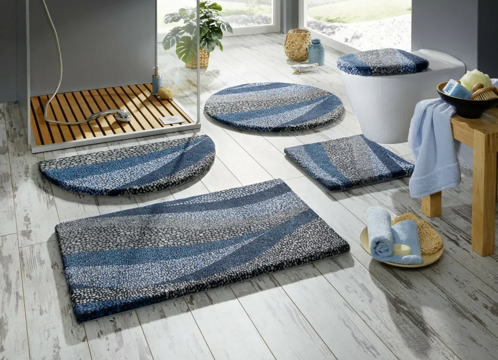 Traumhafte Badgarnitur mit aufwendig bedrucktem Mosaik-Wellendessin für Ihre persönliche Wellness-Oase. Höhe: ca. 8 mm. Mit Bandeinfassung gearbeitet sowie mit rutschhemmender Latex-Rückseite ausgestattet.