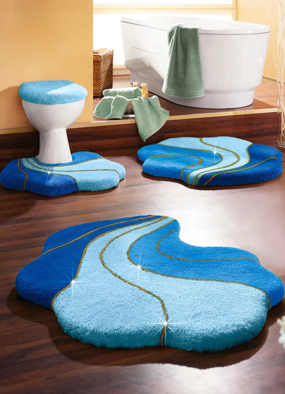 Barfußweiche Badgarnitur Gold-Glitzergarn in Größe 109 (WC-Deckelbezug mit Kordel, 47/50 cm) und in Blau.