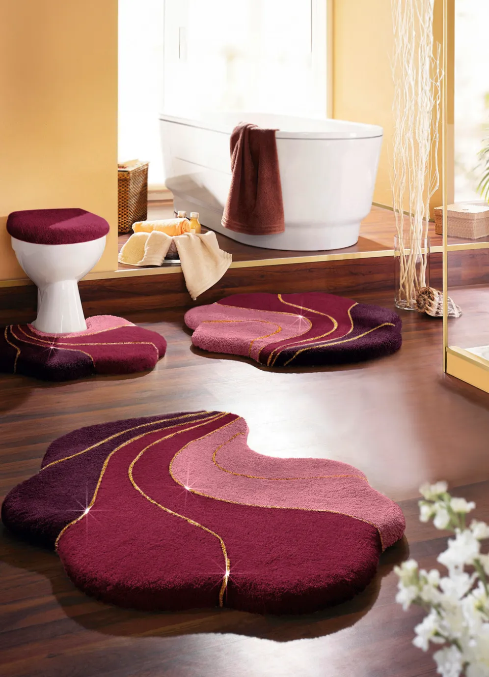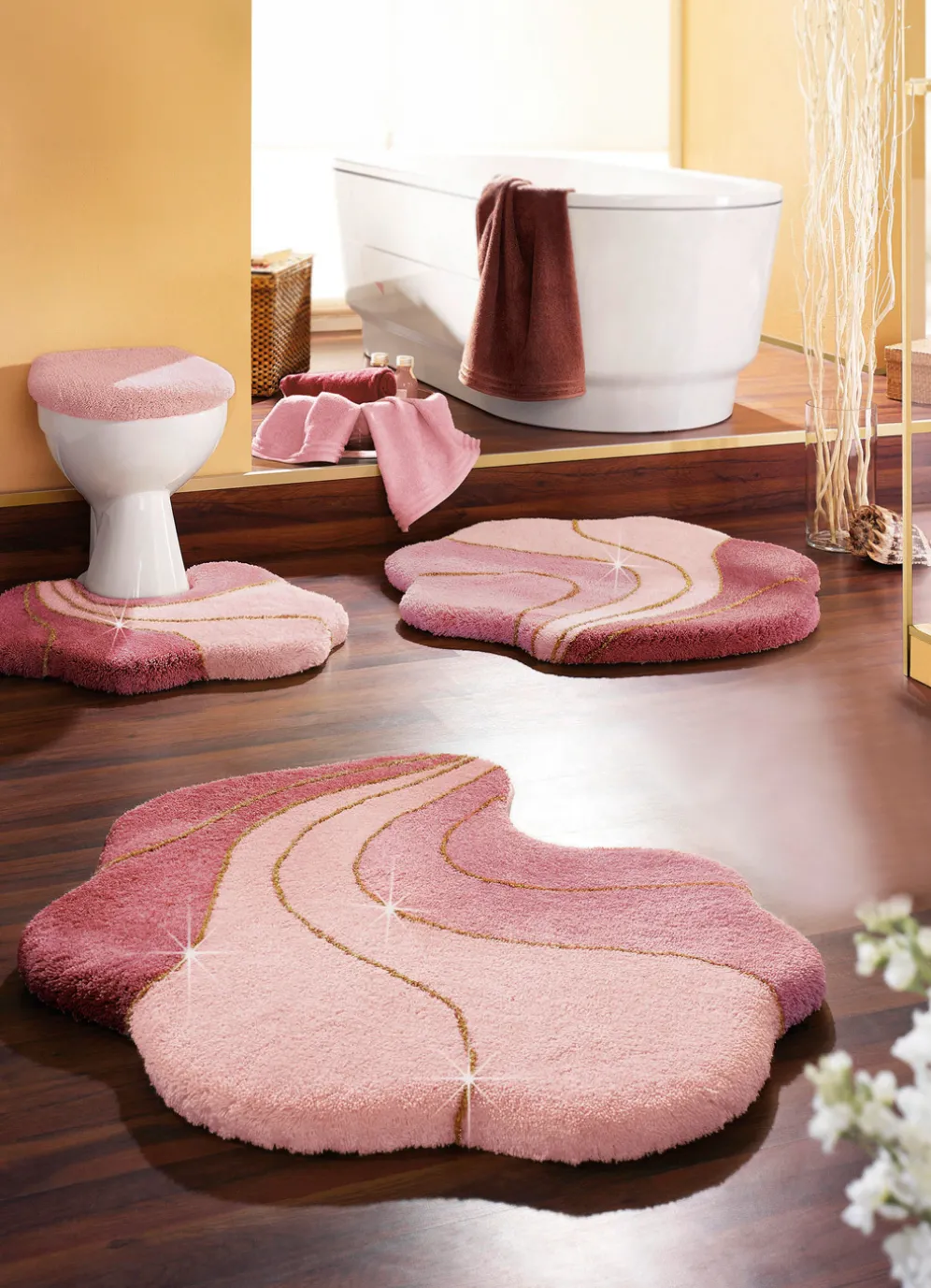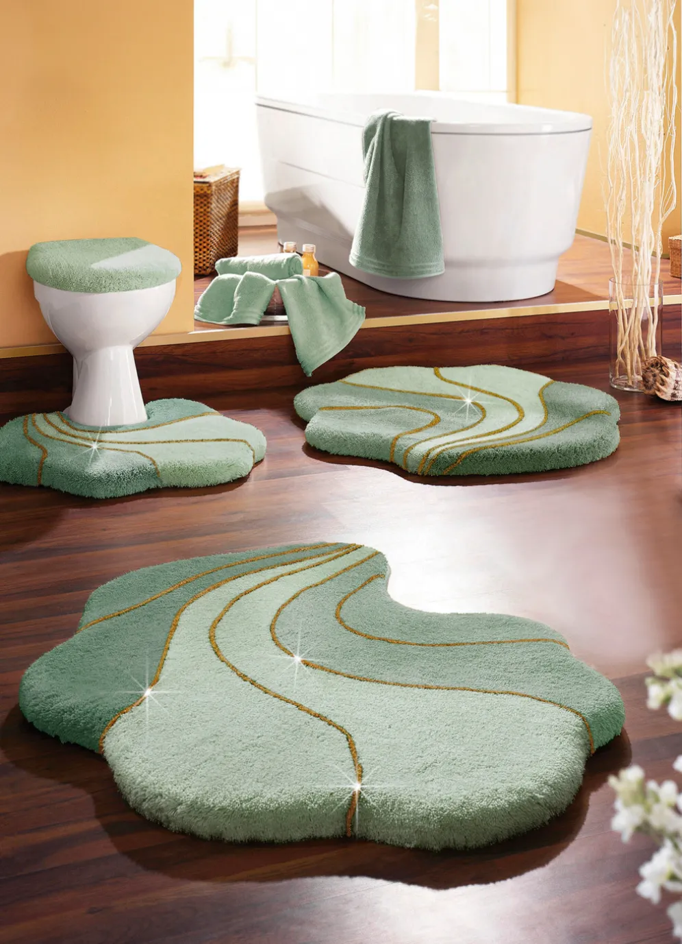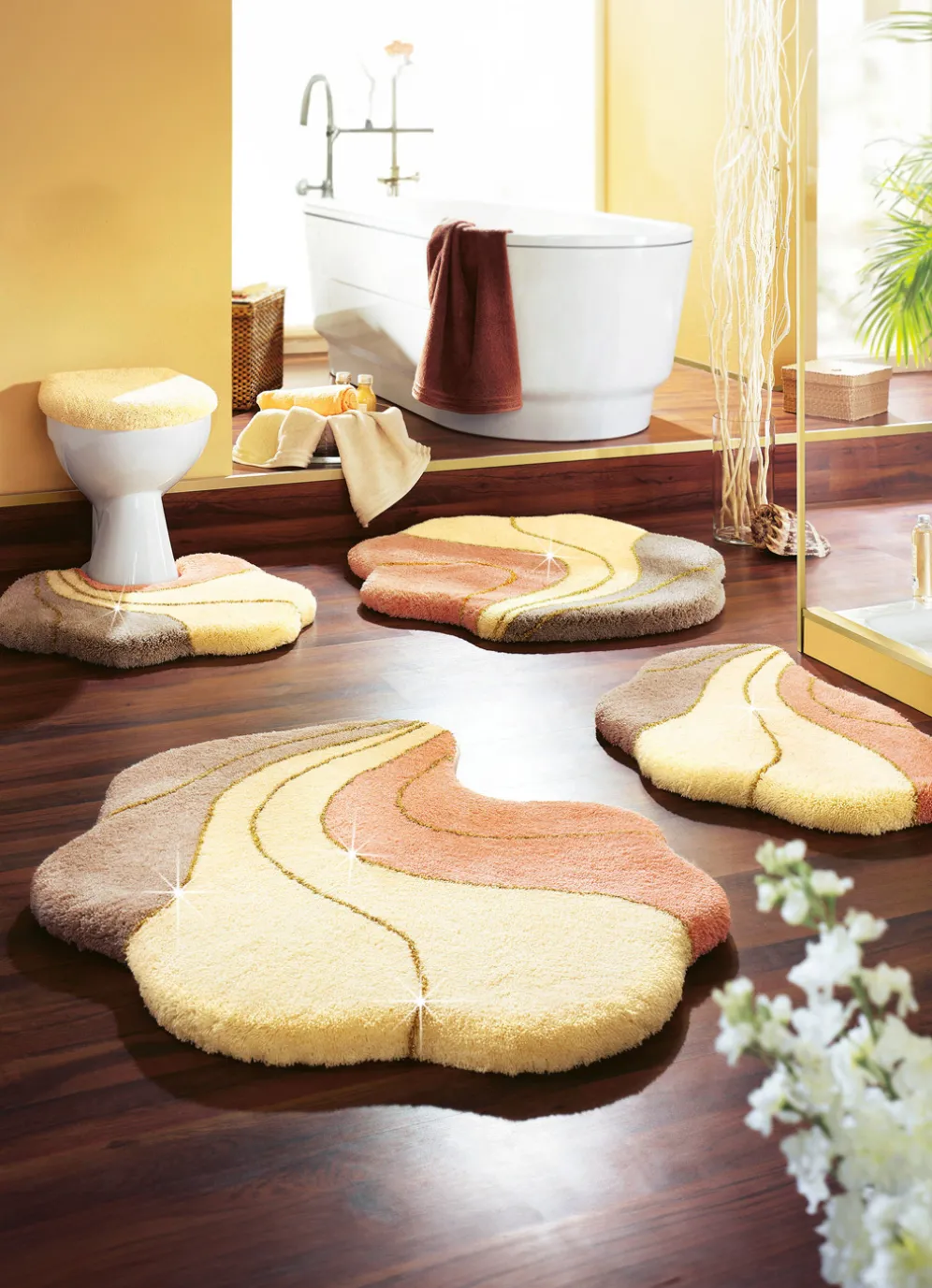 Mit stilvoll kombinierten, zarten Harmonietönen glänzt diese Badgarnitur. Die einzelnen Farbflächen sind durch Gold-Glitzergarn dekorativ voneinander abgesetzt. Mit der geschwungenen Randgestaltung und dem angenehmen, barfußweichen Flor setzen Sie zusätzlich elegante Akzente in Ihrem Bad! Mit rutschhemmend latexierter Rückseite. Höhe: 20 mm.