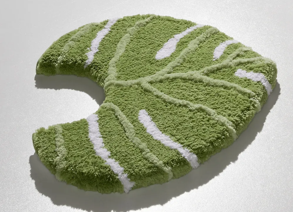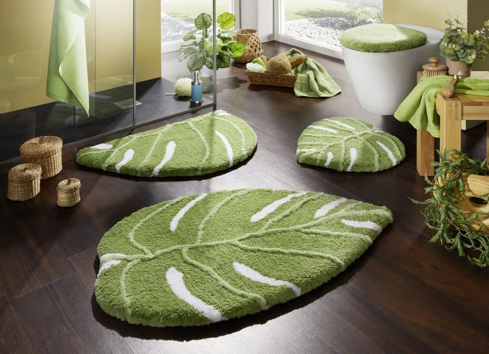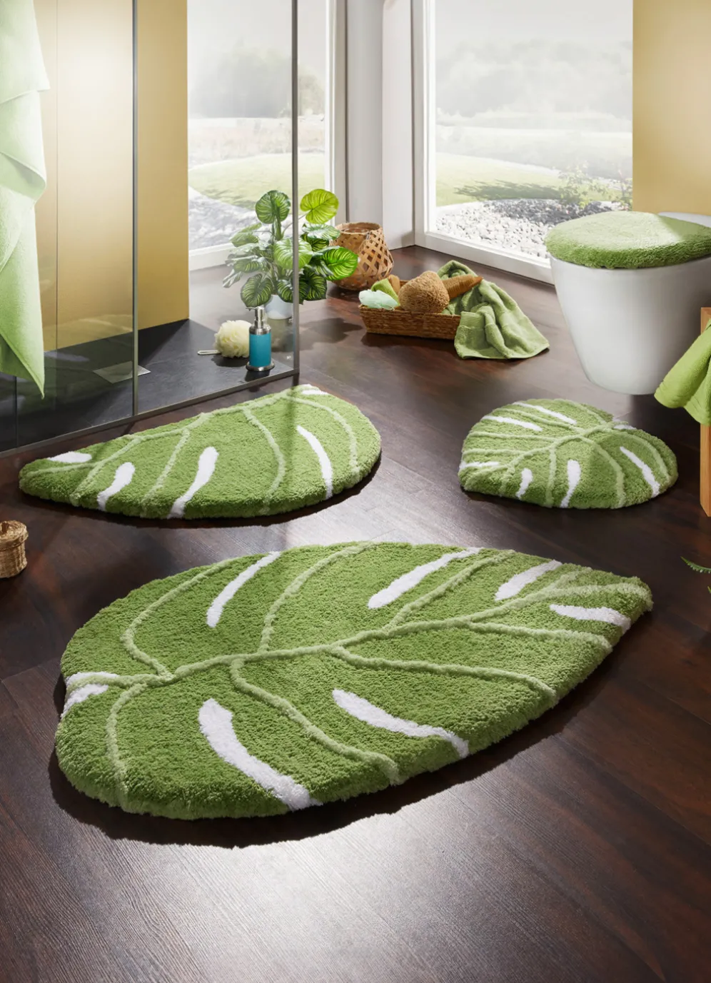 Ein besonders natürlicher Hingucker in Ihrem Badezimmer wird diese barfußweiche und farbharmonische Badgarnitur, die sich als wunderschönes, ausgeformtes Blatt präsentiert. Mit rutschhemmend latexierter Rückseite. Höhe: ca. 25 mm. Die pflegeleichte, flusenfreie Qualität: Table Tuft aus 100% Premium-Polyester „Supersoft“. Waschbar bis 30 °C. Für Trockner und Fußbodenheizung geeignet