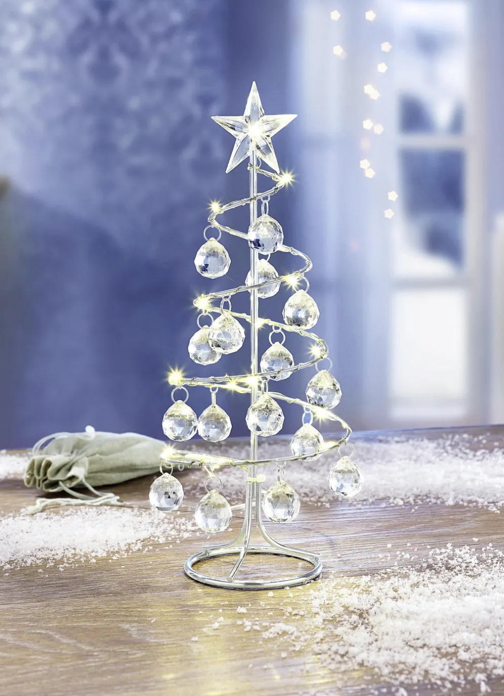 Eine bezaubernde Dekorations-Idee für Ihr Zuhause ist dieses LED-Bäumchen mit seinem warmweißen Licht. Aus Metall gefertigt und mit vielen glitzernden Kunststoffsteinen sowie einem Stern verziert. Batteriebetrieben mit 3x 1,5 Volt Mignon (nicht im Lieferumfang enthalten). Zuleitung zum Batteriefach 27 cm. Das Batteriefach ist in einem Jutesäckchen verpackt.
