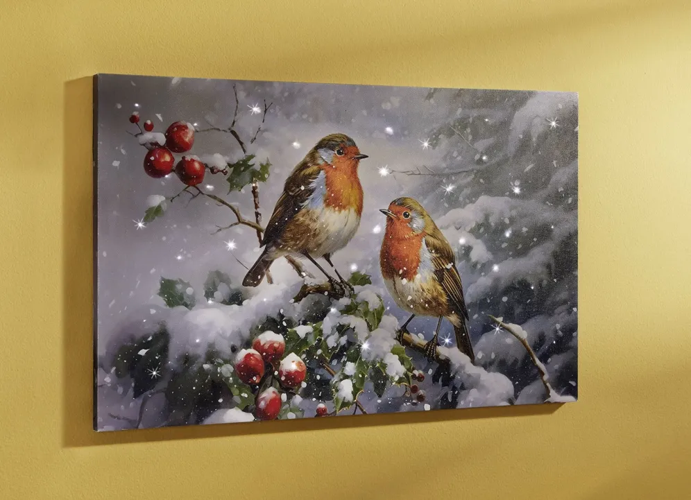 Dieses wundervolle LED-Bild zeigt zwei Rotkehlchen auf einem winterlich, verschneiten Ast. Mit An- und Ausschalter und Fernbedienung. Beleuchtet mit 40 kleinen Fiberglas-Lämpchen. Batteriebetrieben mit 2x 1,5 Volt Mignon (nicht im Lieferumfang enthalten), Fernbedienung mit 1x Knopfzelle CR2025 (im Lieferumfang enthalten). Auf einen Holzrahmen gezogene Leinwand. Maße: B55xH35xT1,8 cm