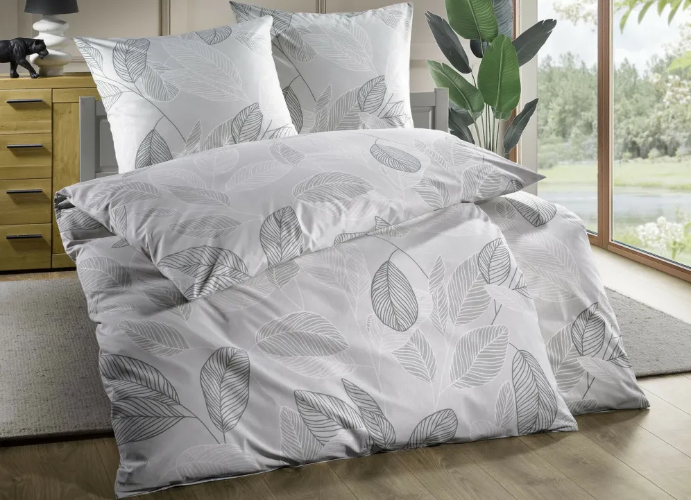 Diese beidseitig bedruckte Bettwäsche-Garnitur aus dem Hause „Dobnig” möchte Sie mit ihrem Blätter-Dessin gern ins Reich der Träume begleiten. Mit praktischem Reißverschluss gearbeitet.