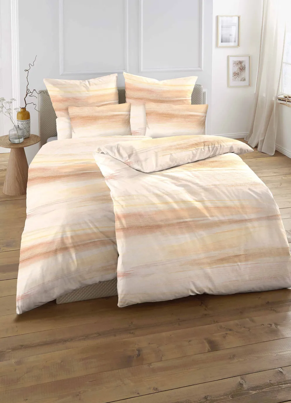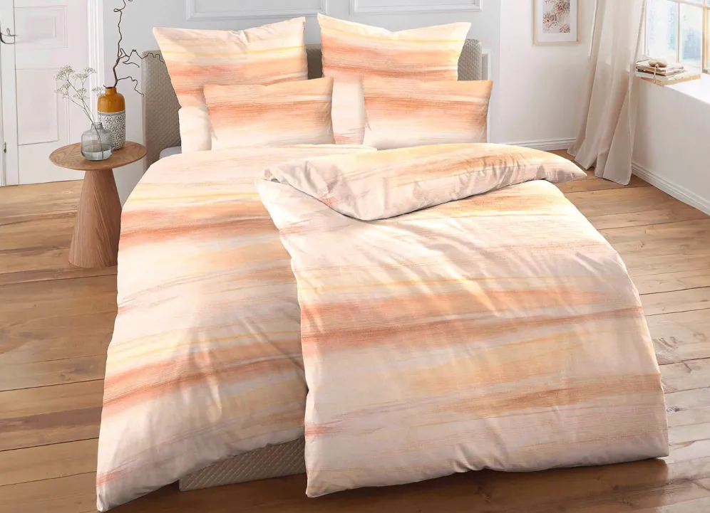 Mit dieser beidseitig bedruckten Bettwäsche-Garnitur aus dem Hause „biberna“ in harmonischem Farbverlauf liegen Sie auf einer Wellenlänge mit den neuesten Dessin-Trends. Mit praktischem Reißverschluss. Qualität: bügelleichter Biber aus 100% Baumwolle. Waschbar bis 60 °C und trocknergeeignet