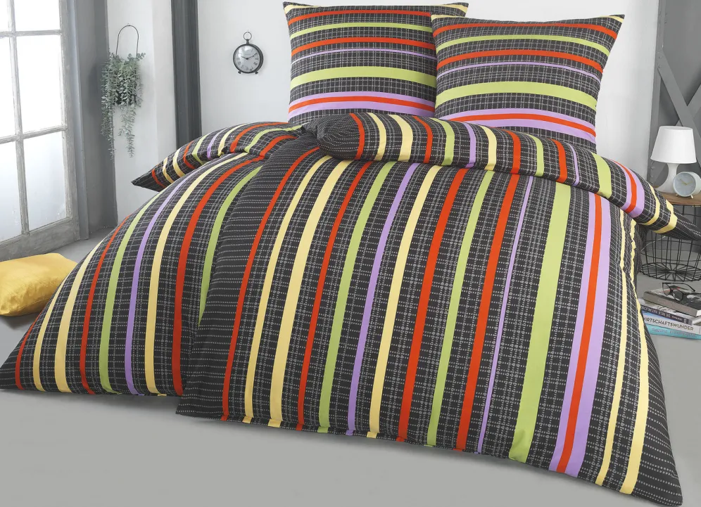 Herrlich bunte Streifen zieren diese beidseitig bedruckte Bettwäsche-Garnitur von „Dobnig“. Mit praktischem Reißverschluss. Qualität: Microfaser aus 100% Polyester. Waschbar bis 60 °C und trocknergeeignet