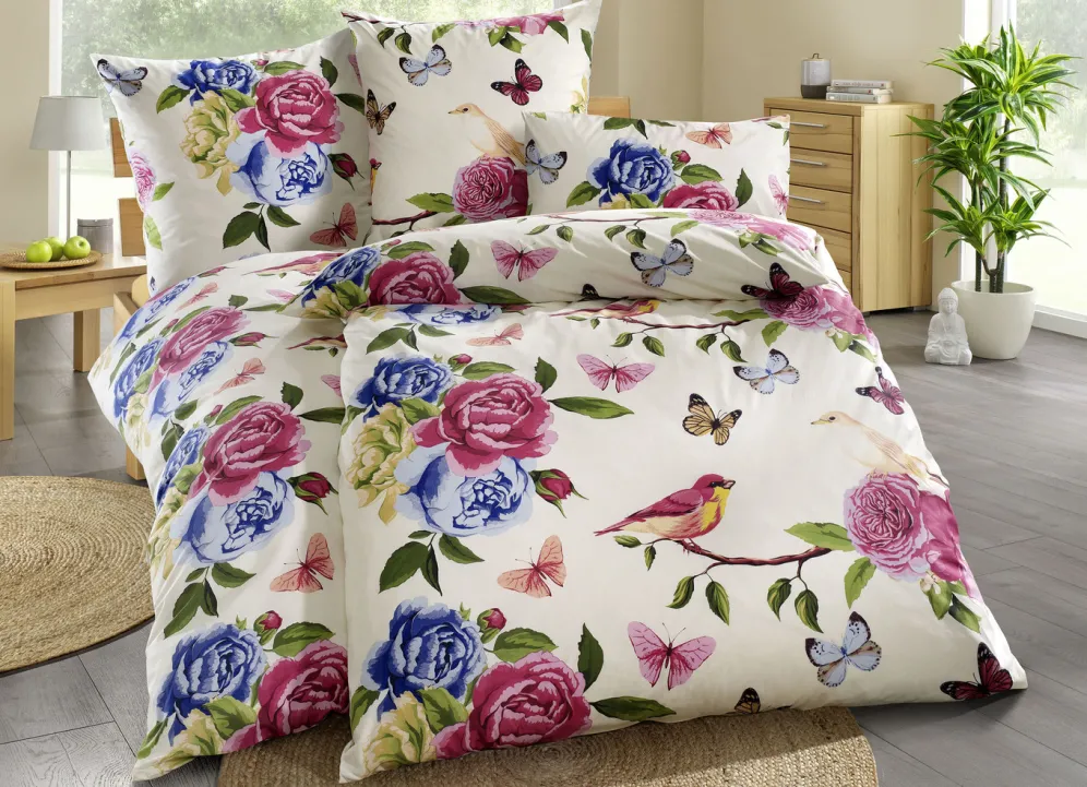 Freuen Sie sich auf traumhaft schöne Nächte und lassen Sie sich von den charmanten, frühlingshaften Dessins dieser beidseitig bedruckten Bettwäsche-Garnituren von „Florella“ beeindrucken. Durch den Pigmentdruck zeigen sich Vögelchen, Blüten und Schmetterlinge in wunderbar leuchtenden Farben und sind ein absoluter Hingucker in Ihrem Schlafzimmer. Mit praktischem Reißverschluss. Waschbar bis 60 °C und trocknergeeignet