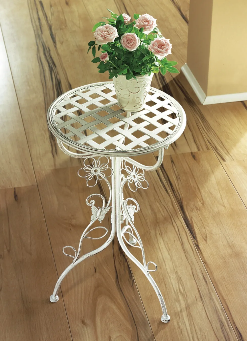 Wunderschöner, sehr dekorativer Beistelltisch aus antikcremefarbenem Eisen: im Landhausstil, in geschwungener Form, mit eingearbeiteten Schmetterlings- und Blumen-Verzierungen am Gestell.