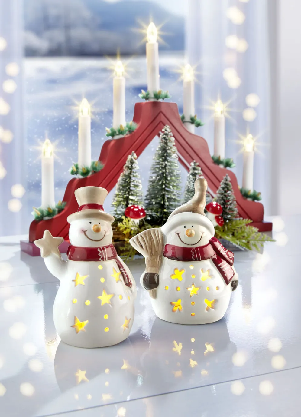 Diese beiden liebevoll gestalteten Schneemänner mit Mütze und Zylinder sowie einem roten Schal werden garantiert zum weihnachtlichen Hingucker in Ihren 4 Wänden. Durch die warm-weiße LED-Beleuchtung sorgen sie für stimmungsvolles Licht.