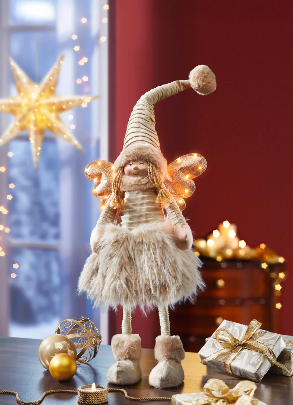 Ein niedlicher Blickfang für die Weihnachtszeit ist dieser beleuchtete Engel! Er trägt ein gestreiftes Shirt, einen kuscheligen Rock aus Fell, braune Stoff-Schuhe und eine gestreifte Zipfelmütze. Dank den 19 warm-weißen kleinen LEDs die in die Flügel eingenäht sind sorgt er für stimmungsvolles Licht. Batteriebetrieben mit 2x 1,5 Volt Mignon (nicht im Lieferumfang enthalten). Aus Metall sowie Kunst- und Textilmaterial gefertigt. Maße: B22xH60xT18 cm