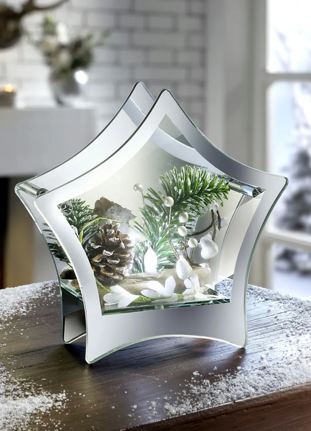 Ein extravagantes Dekorationsstück ist dieser beleuchtete Stern aus Glas, mit raffinierter Spiegelumrandung. Die LED-Beleuchtung im Innern setzt das weihnachtliche Arrangement aus echten Zapfen sowie grünem Beiwerk und Blüten, jeweils aus hochwertigem Kunstmaterial, schön in Szene. Batteriebetrieben mit 3x Knopfzelle LR44 (im Lieferumfang enthalten). Maße: B20xH19,5xT6 cm