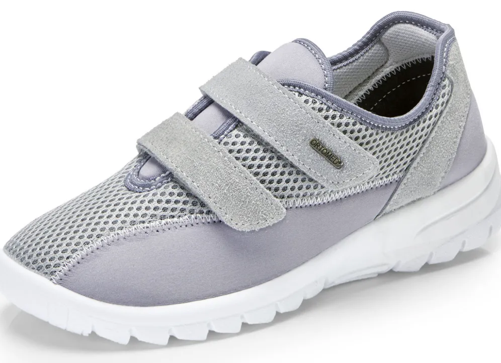 Klettschuhe aus elastischem Textilmaterial: in Weite H, zwei verstellbare Klettspangen, gepolstertes Futter, herausnehmbares Fußbett, leichte PU-Profilsohle sowie 25 mm Keilabsatz