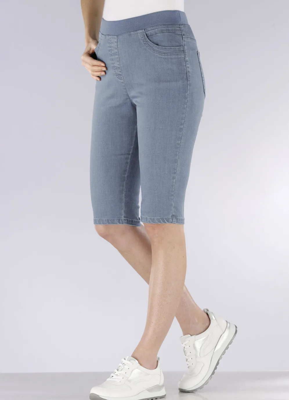 Trendig und superbequem zugleich: Jeans-Bermudas in Schlupfform, formbeständiger Rundum-Dehnbund in Jersey-Qualität, angedeutete Reißverschluss-Zierblende, Seitentaschen, aufgesetzte Gesäßtaschen sowie Jeanssattel. Innenbeinlänge ca. 35 cm