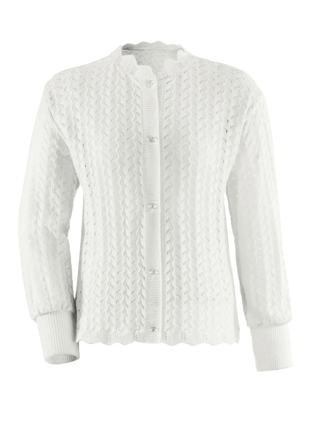 Wenn Sie es sich nach dem Abendessen schon einmal gemütlich machen wollen und Ihr Tagesoutfit aus Jeans, T-Shirt und Cardigan gegen bequeme Nachtwäsche tauschen, ist ein Bettjäckchen genau das Richtige zum Überziehen. Das aus Ajourstrick gefertigte Bettjäckchen mit durchgehender Knopfleiste, einem runden Stehkragen mit dekorativen Bogenkanten und elastischen Bündchen an den langen Ärmeln hält Sie an lauen Übergangsabenden angenehm warm.