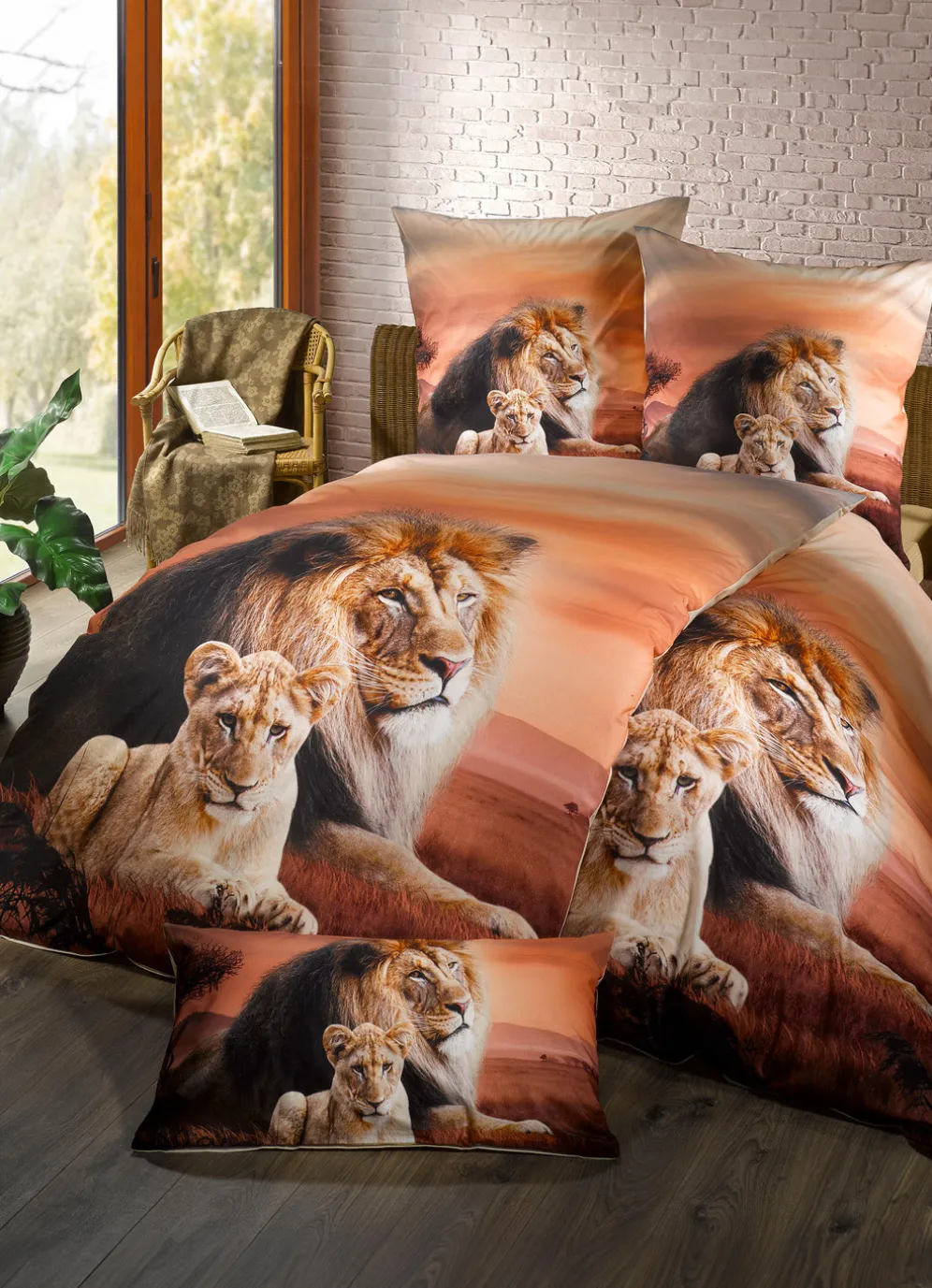 Ein brillanter Digitaldruck mit einem majestätischen Löwen und seinem Jungen ziert die Vorderseite dieser Bettwäsche-Garnitur von „Florella“. Rückseite uni. Mit Reißverschluss ausgestattet. Die Qualität: Soft-Renforcé aus 100% Baumwolle. Waschbar bis 60 °C und trocknergeeignet