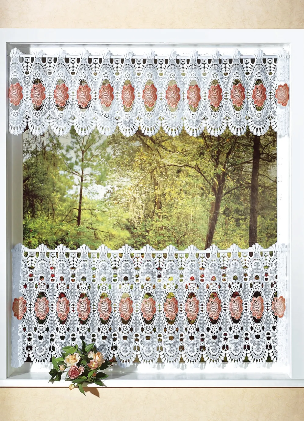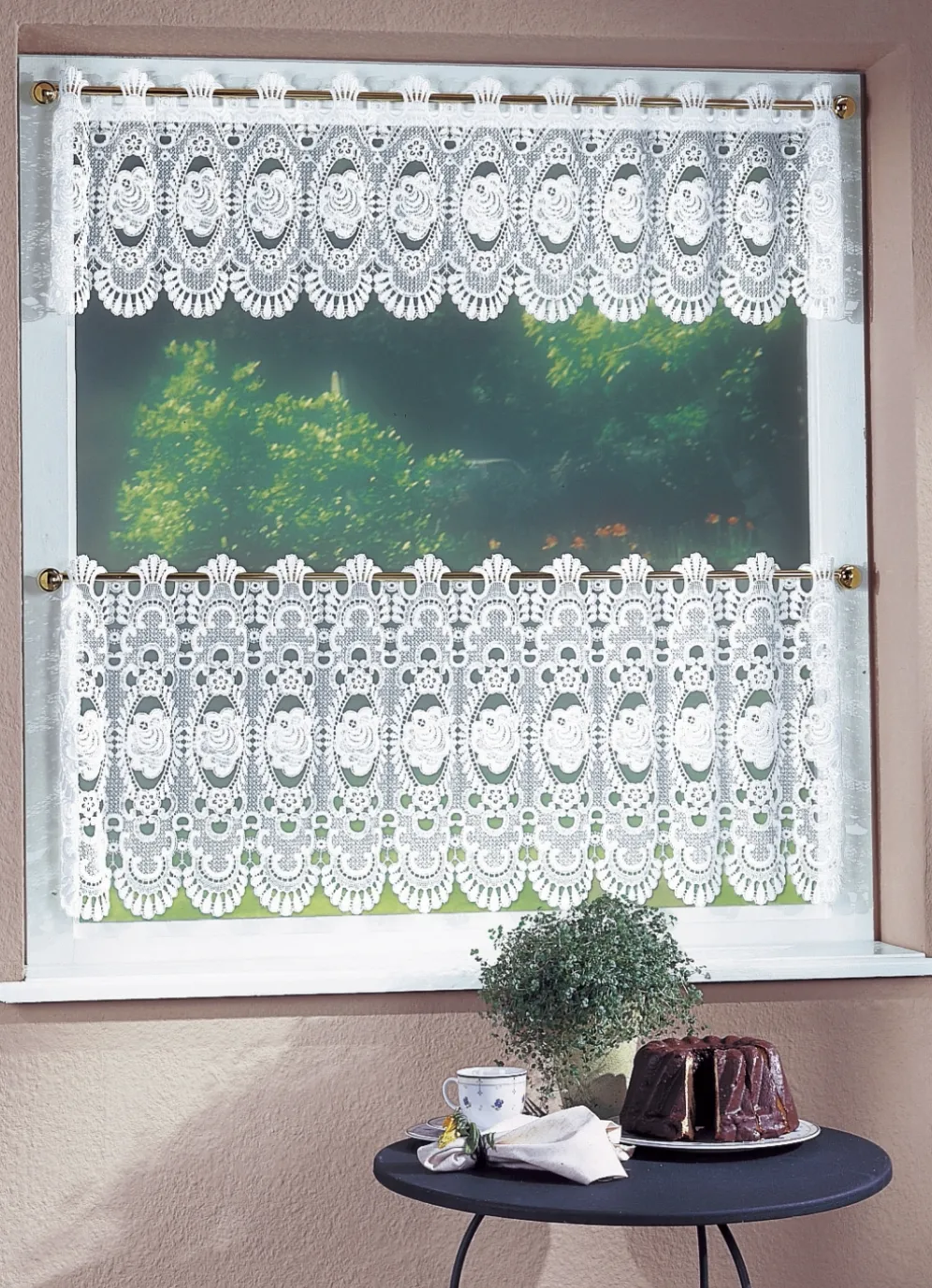 Bezaubernde Kurzgardine mit Plauener Macramé-Spitze und Ösen für den Stangendurchzug.