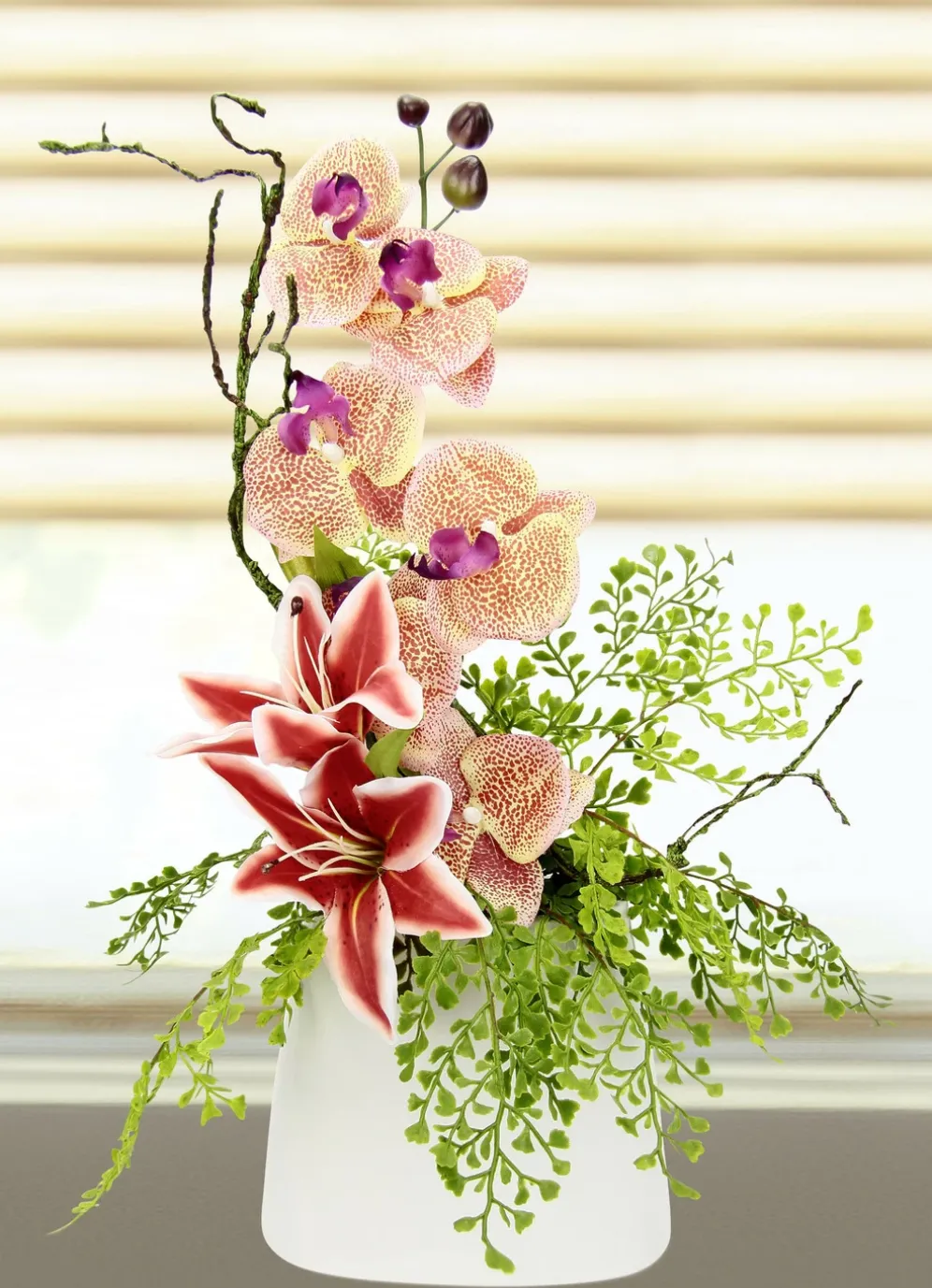 Diese bezaubernde Orchidee aus Kunst- und Textilmaterial sind zusammen mir prachtvollen Lilien und grünem Beiwerk fest in eine weiße Vase aus Keramik eingesetzt. Maße: Höhe 56 cm