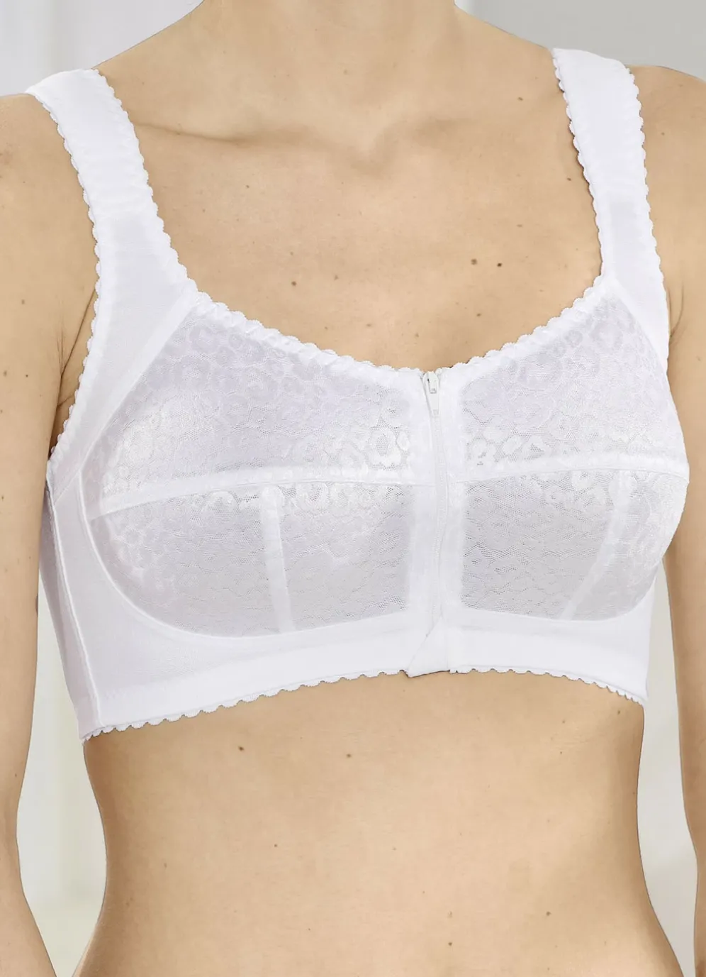 Weißer BH mit dezent glänzendem Jacquard-Dessin in den unterlegten Cups, Vorderreißverschluss, verstärktem Rückteil sowie breiten, im Schulterbereich weich gepolsterten, verstellbaren Stretchträgern.