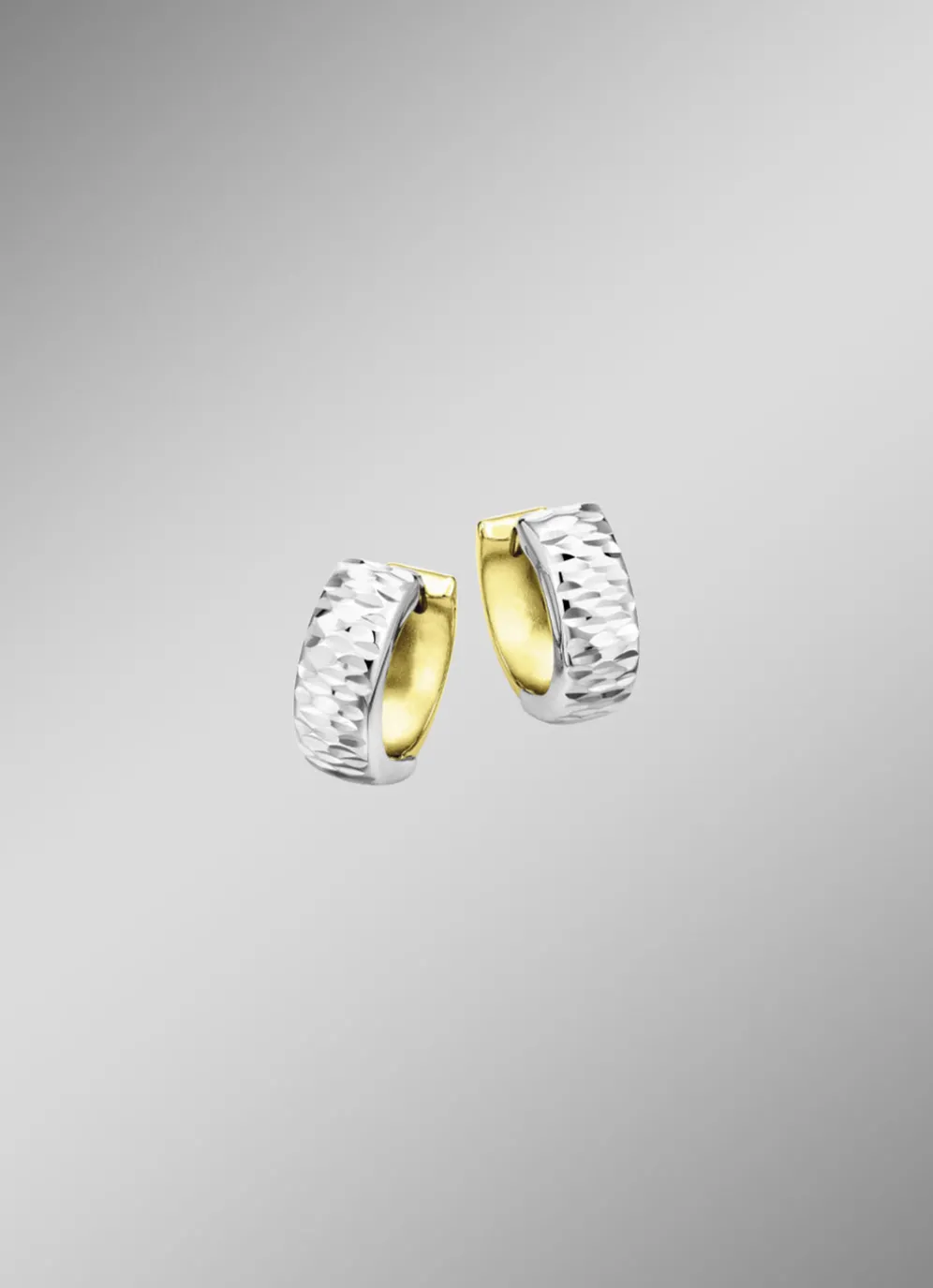 aus Gold 375/- Diese stilvollen Klappcreolen aus feinem Gold 375/- vereinen Eleganz und Raffinesse in einem kompakten Design mit 13 mm Durchmesser. Das edle Bicolor-Finish und die diamantierte Oberfläche sorgen für ein faszinierendes Spiel aus Licht und Struktur.
