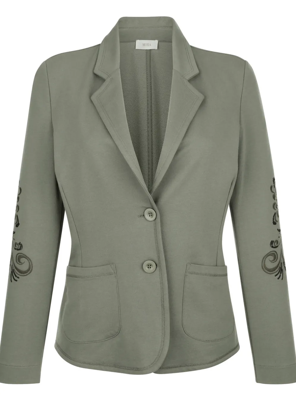 Ein echtes Highlight ist dieser leicht taillierte Blazer mit hübscher Stickerei auf den Ärmeln, Reverskragen, Knopfleiste sowie aufgesetzte Taschen. Länge ca. 59 cm.