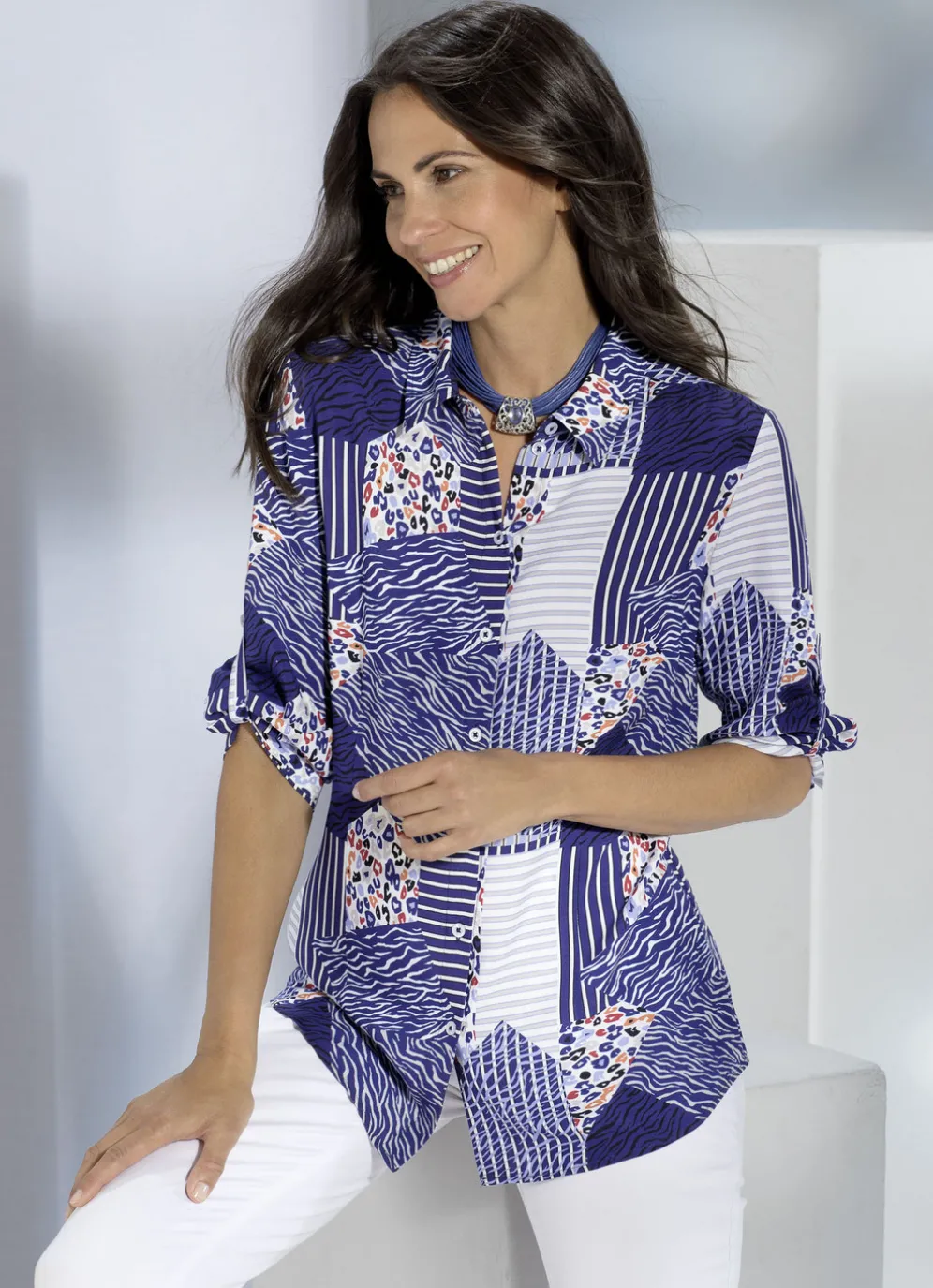 Mit farbbrillantem Druck in Blau-Weiß-Taupe-Bunt ausgestattet ist diese hübsche Bluse mit Hemdkragen, Knopfleiste sowie krempelbaren, 3/4-langen Manschettenärmeln.