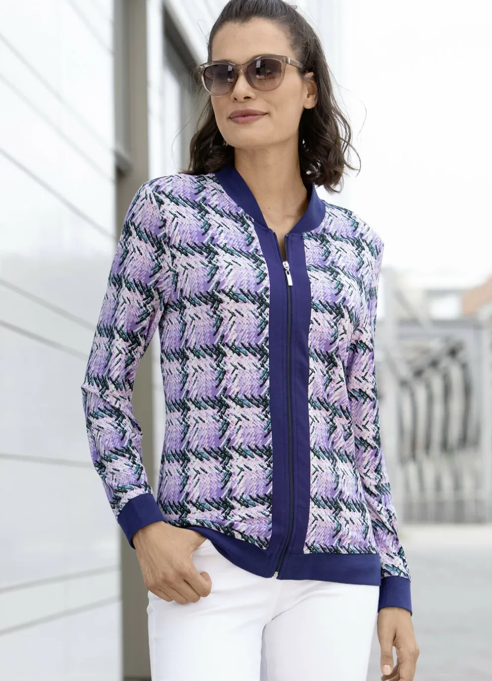 Mit farbbrillantem Inkjet-Druck in Lila-Marine-Rosé-Bunt zeigt sich diese aparte Blusenjacke mit feinem Rippenstrick am Stehkragen, entlang der Reißverschlussleiste, an den Abschlüssen der langen Ärmel sowie am Saum rundum.